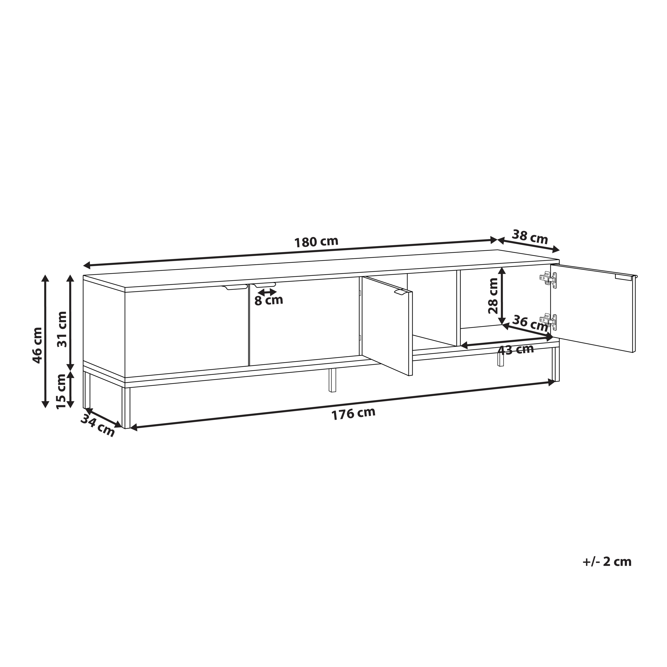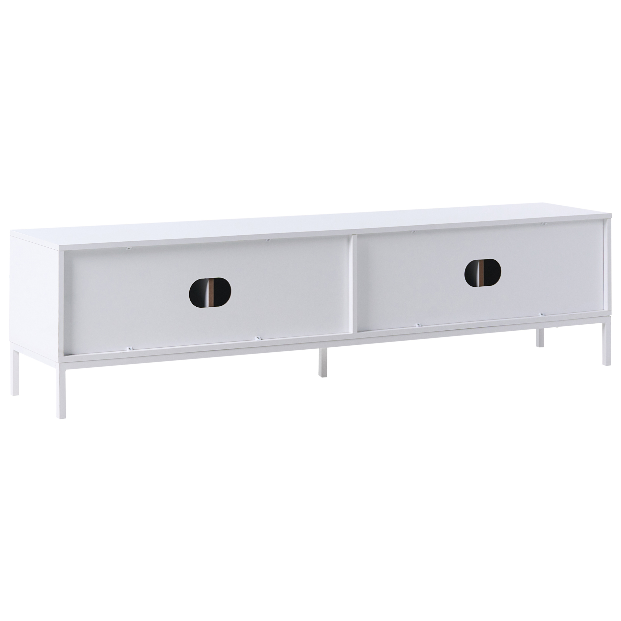 Moderni TV-taso kaapeilla. Tuo olohuoneeseen tyyliä ja käytännöllistä säilytystilaa tällä nykyaikaisella TV-tasolla. Kestävästä MDF-levystä valmistettu TV-taso on viimeistelty kauniin valkoiseksi ja uurretuilla etuosilla, jotka lisäävät hienovaraista tekstuuria ja luonnetta, säilyttäen siistin ja elegantin ilmeen. Siinä on kaapeliläpivienti, joka auttaa pitämään johdot piilossa ja järjestyksessä, sekä neljä ovien taakse piilotettua hyllyä, jotka tarjoavat monipuolista säilytystilaa pelitarvikkeille, konsoleille ja muille tärkeille esineille. Kapeat rautajalat tuovat kevyttä, ilmavaa tuntua, joka sopii erinomaisesti sekä moderneihin että klassisiin sisustuksiin.
