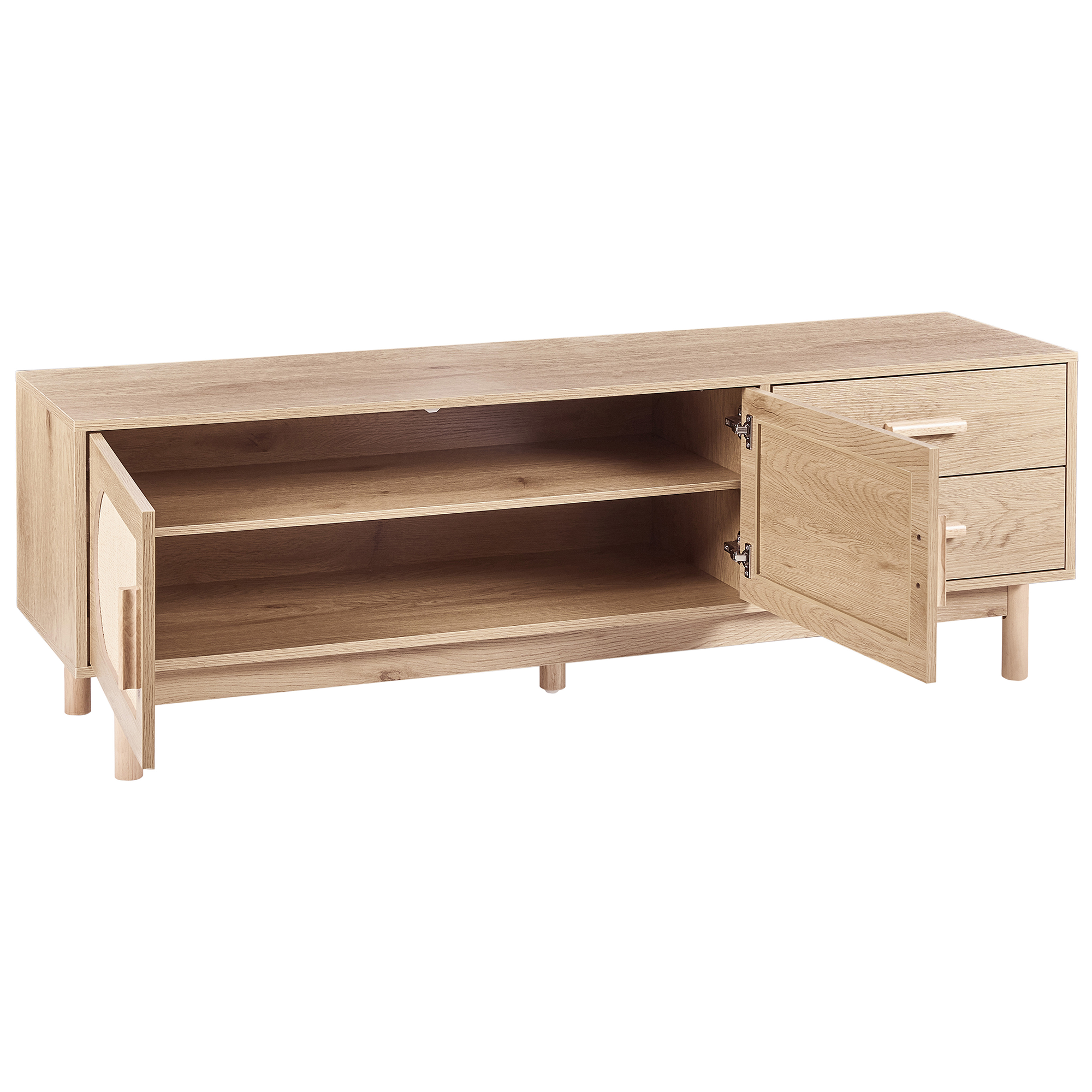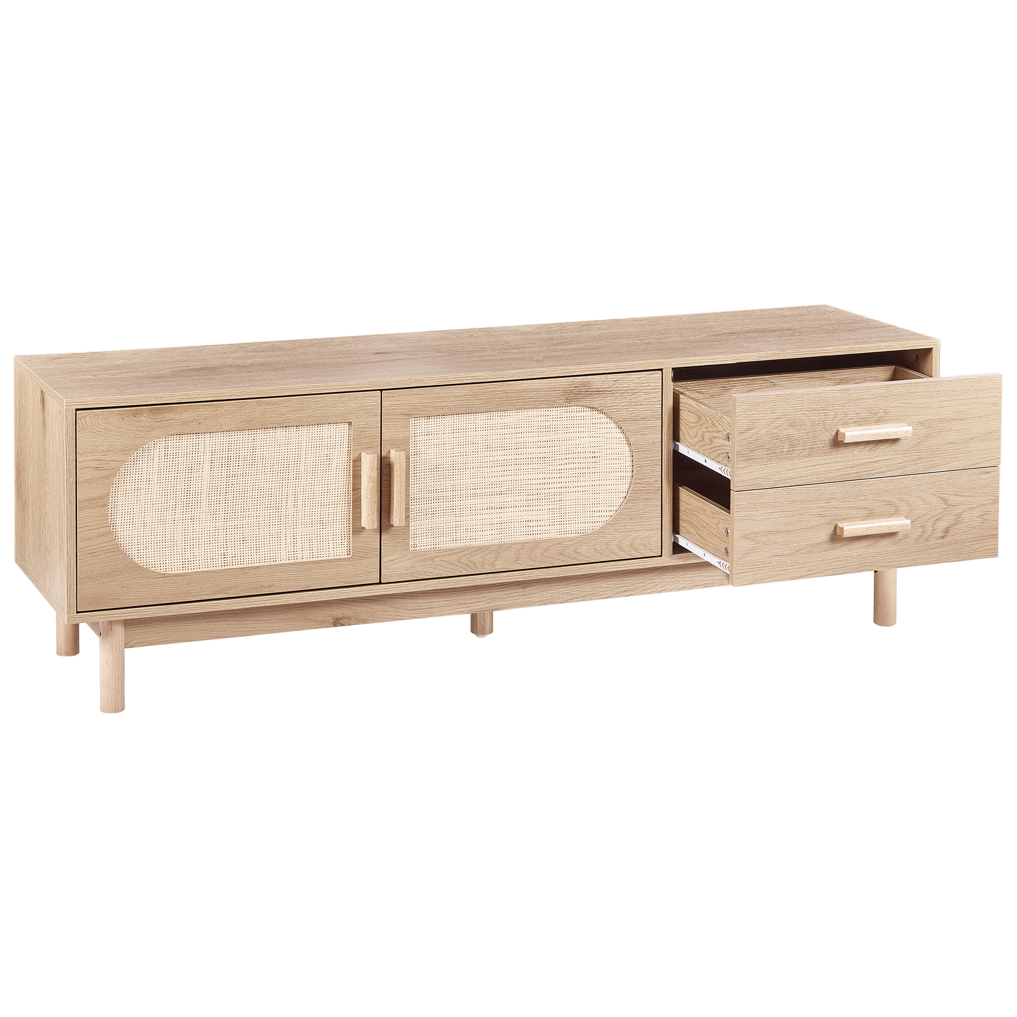Boheemi TV-taso wieniläispunoksella 70ʺ televisiolle. Tuo olohuoneeseen rentoa boho-tunnelmaa tällä viehättävällä TV-tasolla. Vaaleanruskea sävy ja ovien etuosan koristeellinen wieniläispunos luovat esteettisen ja näyttävän ilmeen. TV-tason runko on valmistettu laadukkaasta lastulevystä ja jalat kumipuusta, mikä antaa sille luonnollisen ilmeen. Siinä on tilava kaappi, jossa on kaksi hyllyä, sekä kaksi laatikkoa, jotka tarjoavat runsaasti tilaa erilaisten tarvikkeiden siistiin säilyttämiseen.