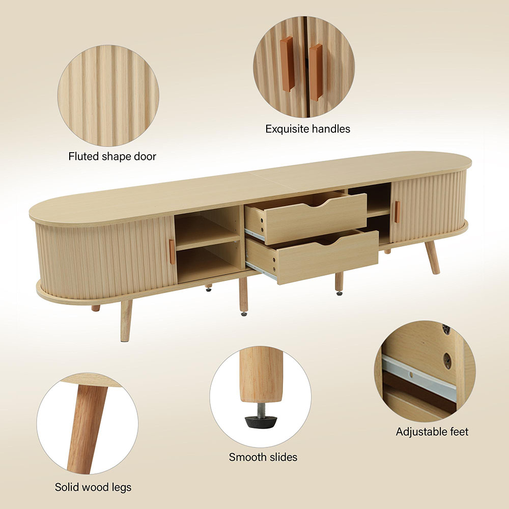 KOMHTOM-tv-taso yhdistää modernin muotoilun ja käytännöllisyyden helppoon käyttökokemukseen. Sen vaalean pähkinänsävyinen pinta sopii saumattomasti esimerkiksi olohuoneeseen, makuuhuoneeseen tai työhuoneeseen. Ovaalinmuotoinen kaappi poikkeaa perinteisestä suorakulmaisesta muodosta ja tuo pehmeyttä tilaan, samalla tehden huoneesta avaramman ja kevyemmän näköisen.