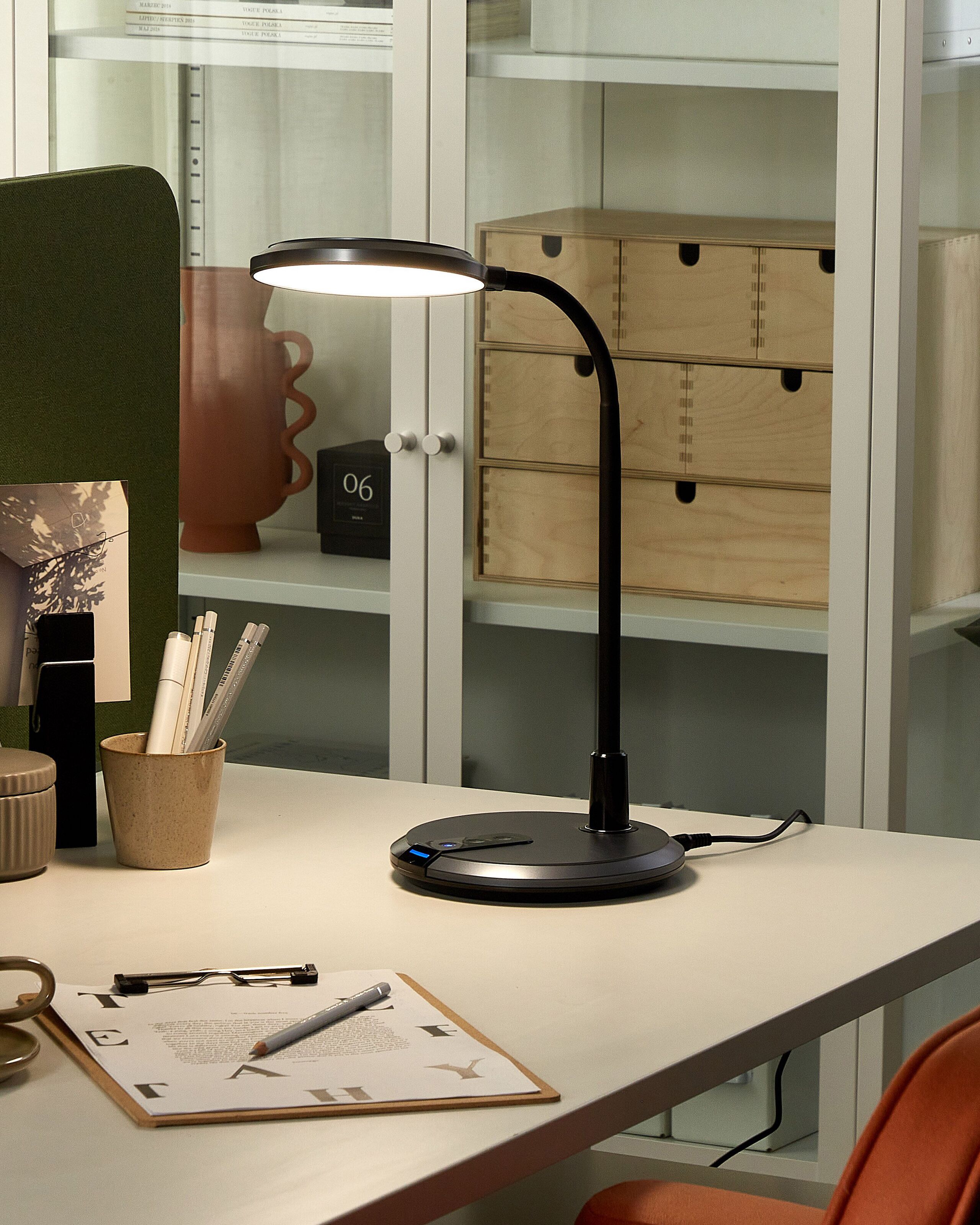 Moderni työpöydän valaisin himmentimellä. Moderni LED-pöytävalaisin tarjoaa pehmeän valon, joka tekee lukemisesta, kirjoittamisesta tai työskentelystä entistä helpompaa ja mukavampaa. Pyöreä varjostin valaisee laajan alueen kerralla, kun taas säädettävä jalka mahdollistaa valon kohdentamisen tarpeen vaatiessa. Kosketuskäyttöinen ohjauspaneeli on varustettu himmennintoiminnolla sekä kolmella värilämpötilalla.
