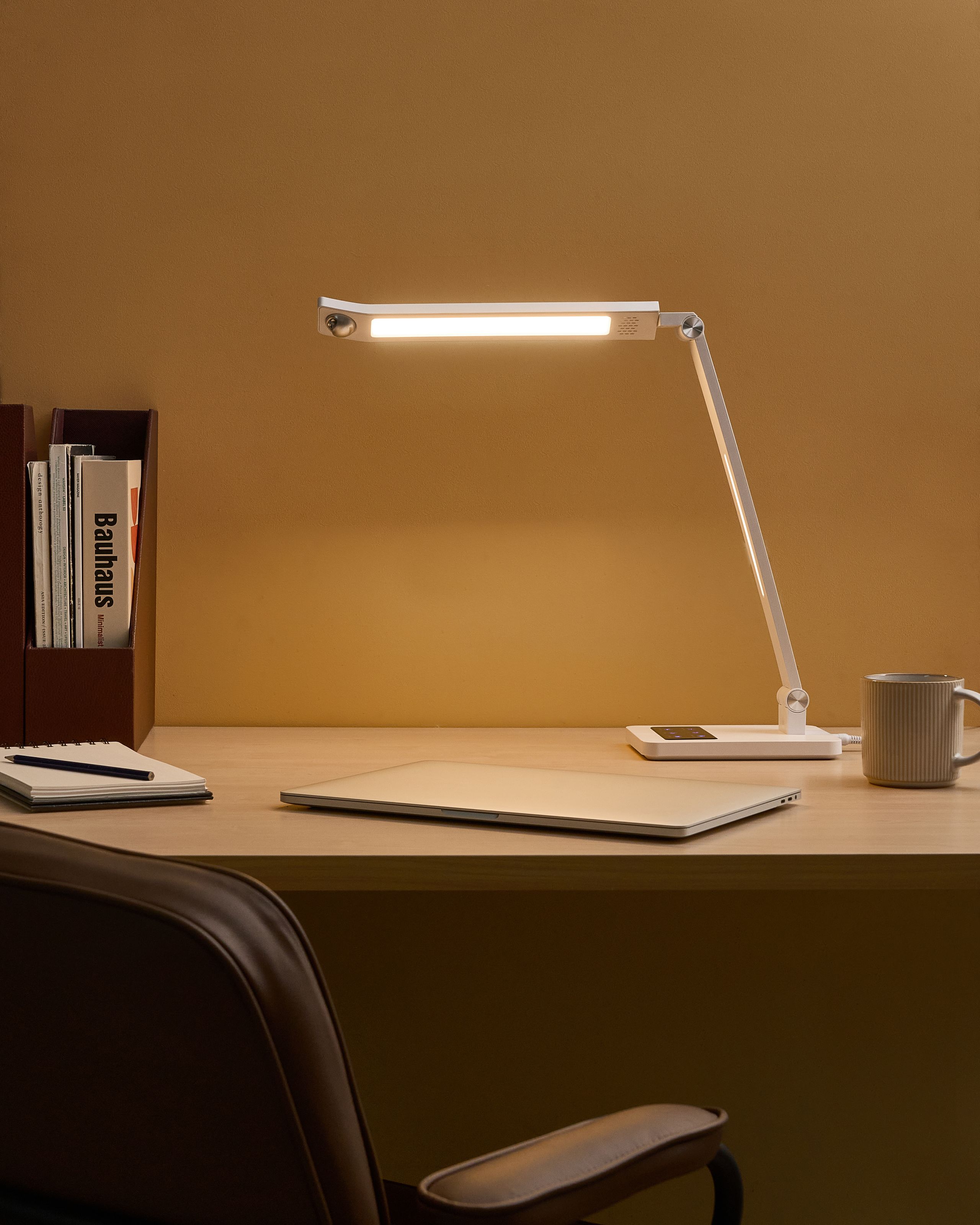 Säädettävä työpöydän valaisin himmentimellä. Lisää kotitoimistoon sekä tyyliä että toiminnallisuutta tällä modernilla pöytävalaisimella. Kestävästä ABS-muovista valmistettu valaisin on varustettu portaattomasti säädettävällä himmentimellä, jossa on kolme valon värilämpötilaa yksilöllisen valaistuksen luomiseen. Taukomuistutus-toiminto vilkkuu 30 minuutin välein auttaen ylläpitämään terveellisiä työtapoja, ja liiketunnistin sytyttää ja sammuttaa valon automaattisesti käytön mukaan. Sivulle säteilevä häikäisynestovalo minimoi silmien rasitusta ja parantaa näkyvyyttä, mikä tekee valaisimesta ihanteellisen tietokoneella työskentelyyn. Säädettävät varsi ja varjostin tarjoavat joustavuutta, minkä ansiosta valo voidaan suunnata juuri sinne, missä sitä eniten tarvitaan.
