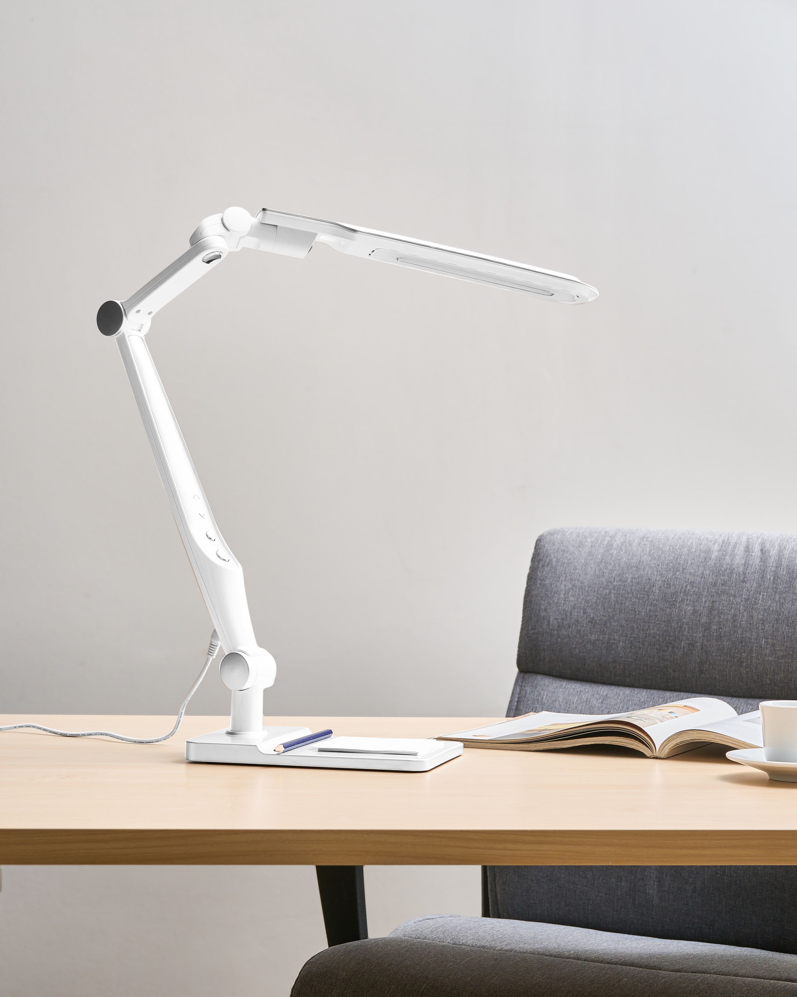 Säädettävä toimistovalaisin himmentimellä. Tämä moderni LED-pöytävalaisin on suunniteltu tuomaan kotitoimistoon sekä tyyliä että mukavuutta. Sen tyylikäs, minimalistinen muotoilu sulautuu saumattomasti mihin tahansa työtilaan, tarjoten samalla käytännöllisiä ominaisuuksia. Valaisimessa on portaattomasti säädettävä himmennin tarkkaan kirkkauden säätämiseen sekä kolme eri värilämpötilaa, joista voidaan valita lämmin, neutraali tai viileä valo, tehtävästä riippuen. Säädettävät varsi ja varjostin tarjoavat maksimaalisen joustavuuden ja varmistavat, että valo on suunnattu aina sinne, missä sitä eniten tarvitaan. Yksinkertaiset ja intuitiiviset säätimet, jotka sijaitsevat kätevästi varressa, tekevät päivittäisestä käytöstä vaivatonta.