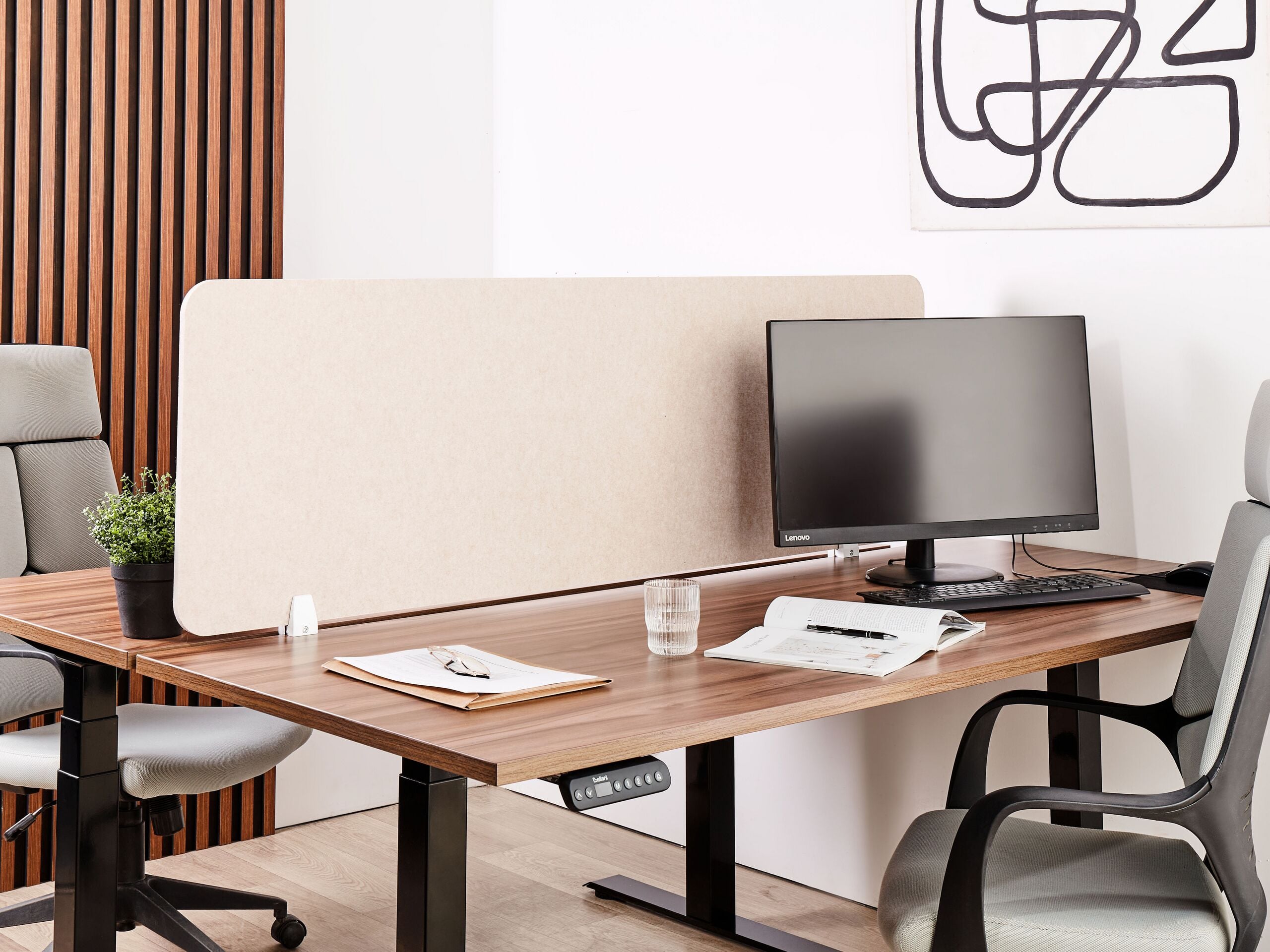 Akustinen pöytäsermi kiinnikkeillä. Paranna työpöydän yksityisyyttä tällä suorakulmaisella työpöydän väliseinällä. Kestävästä PET-materiaalista valmistettu pöytäsermi ei vaadi päivittäistä ylläpitoa. Sen mukana toimitetaan klipsikiinnikkeet, joiden avulla kiinnitys työpöytään onnistuu helposti ja nopeasti. Väliseinä suojaa käyttäjää, asiakirjoja ja tietokoneen näyttöä ei-toivotuilta katseilta. Beige polyesteriverhoilu saa sen sulautumaan vaivattomasti monenlaisiin sisustuksiin.