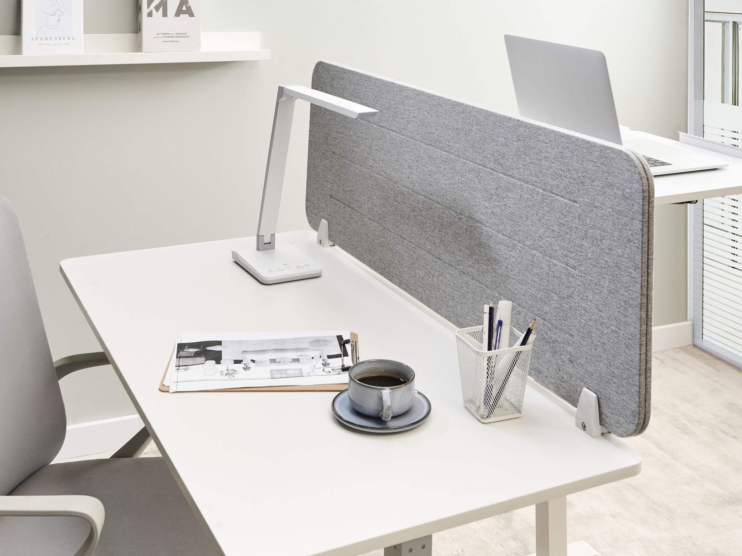 Akustinen työpöydän näkösuoja kiinnikkeillä. Luo tyylikäs ja toimiva työtila tällä hillityllä työpöydän väliseinällä, joka sopii täydellisesti tuomaan tilaan väriä ja mukavuutta. Kestävällä, ääntä vaimentavalla polyesterikankaalla verhoiltu sermi auttaa luomaan rauhallisen ja keskittyneen työympäristön. Virtaviivaisen, modernin muotoilun ansiosta se sulautuu kauniisti monenlaisiin nykyaikaisiin sisustuksiin.