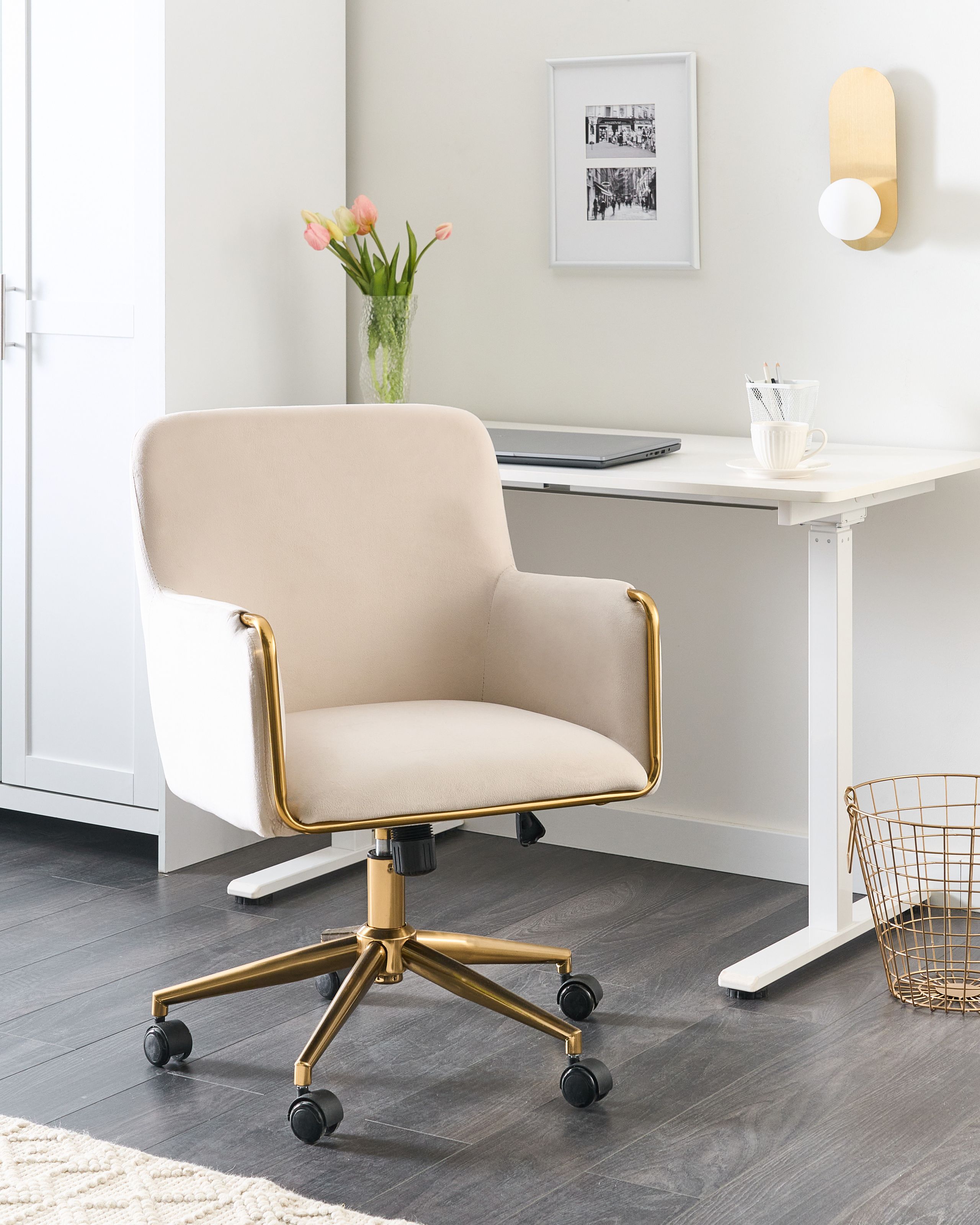 Elegantti toimistotuoli pyörillä. Tämä työtuoli tuo vaivatonta eleganssia mihin tahansa työtilaan. Ylellinen samettiverhoilu ei ainoastaan tarjoa rikasta estetiikkaa, vaan tuntuu myös uskomattoman mukavalta, tehden tuolista ihanteellisen pitkiin istumatunteihin. Mukavuutta ajatellen suunniteltu kallistusmekanismi mahdollistaa selkänojan säätämisen haluttuun kulmaan. Korkeudensäätö takaa täydellisen istumakorkeuden, ja 360 astetta kääntyvä jalusta tarjoaa pehmeän ja vaivattoman liikuteltavuuden. Tukeva kultainen runko täydentää modernia muotoilua, joten tuoli on tyylikäs lisä mihin tahansa huoneeseen. Siinä yhdistyvät toiminnallisuus ja hienostuneisuus, ja se on täydellinen yhdistelmä mukavuutta, joustavuutta sekä ajatonta tyyliä.