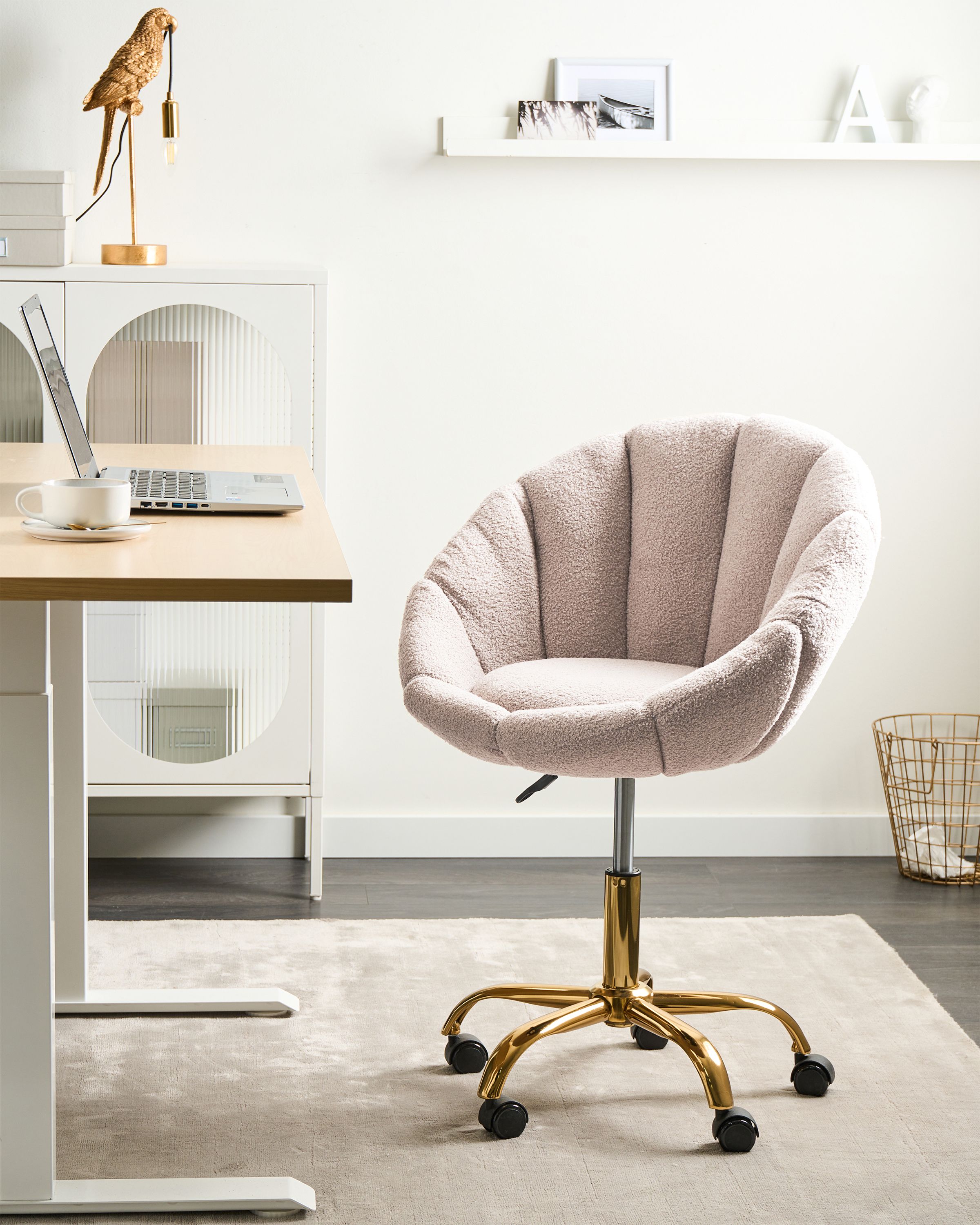 Moderni pyörivä työtuoli säädettävällä istuinkorkeudella. Koe mukavuus ja tyyli tällä modernilla työtuolilla, joka on verhoiltu pehmeällä mutta kestävällä bukleekankaalla. Eleganssia ja toimivuutta varten suunnitellussa työtuolissa on säädettävä istuinkorkeus ja sujuva 360 asteen pyörivyys, mikä tekee siitä täydellisen valinnan jokaiseen kotitoimistoon. Nykyaikainen, tyylikäs muotoilu täydentää vaivattomasti muuta sisustusta tarjoten samalla kestävää tukea opiskeluun tai työntekoon.