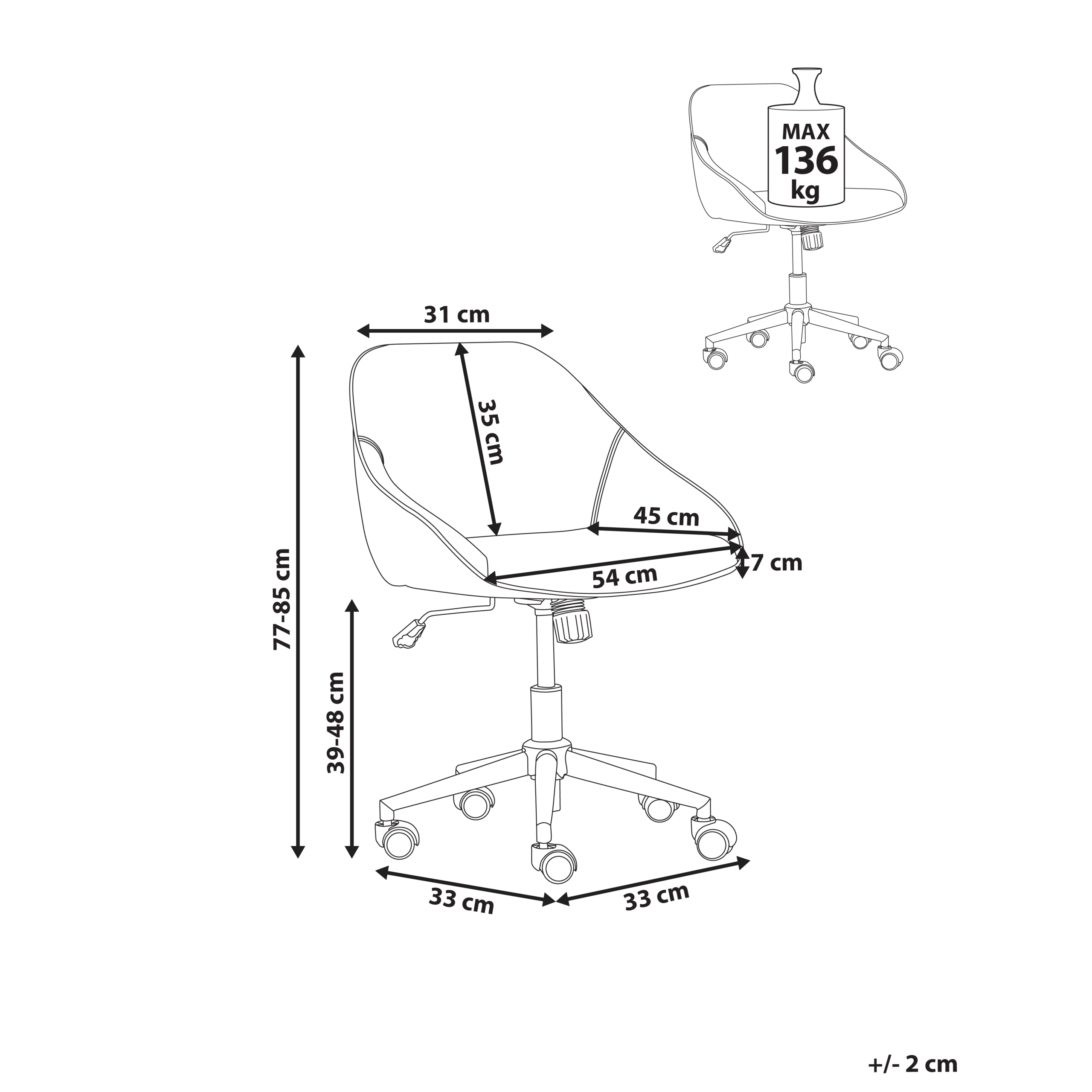 Tyylikäs korkeussäädettävä työtuoli pyörillä. Tämä klassinen työtuoli on tyylikäs ja tarpeellinen lisä mihin tahansa työtilaan. Se on verhoiltu laadukkaalla ja eloisalla laivastonsinisellä samettikankaalla, joka kohottaa kotitoimiston sisustusta. Tukeva, kullanvärisestä teräksestä valmistettu ristikkojalka on varustettu sulavasti rullaavilla pyörillä, ja se täydentää verhoilua varmistaen vakauden sekä helpon liikkuvuuden. Säädettävä korkeus voidaan räätälöidä tarpeen mukaan, ja täysi kääntyvyys sekä kallistustoiminto lisäävät toiminnallisuutta.