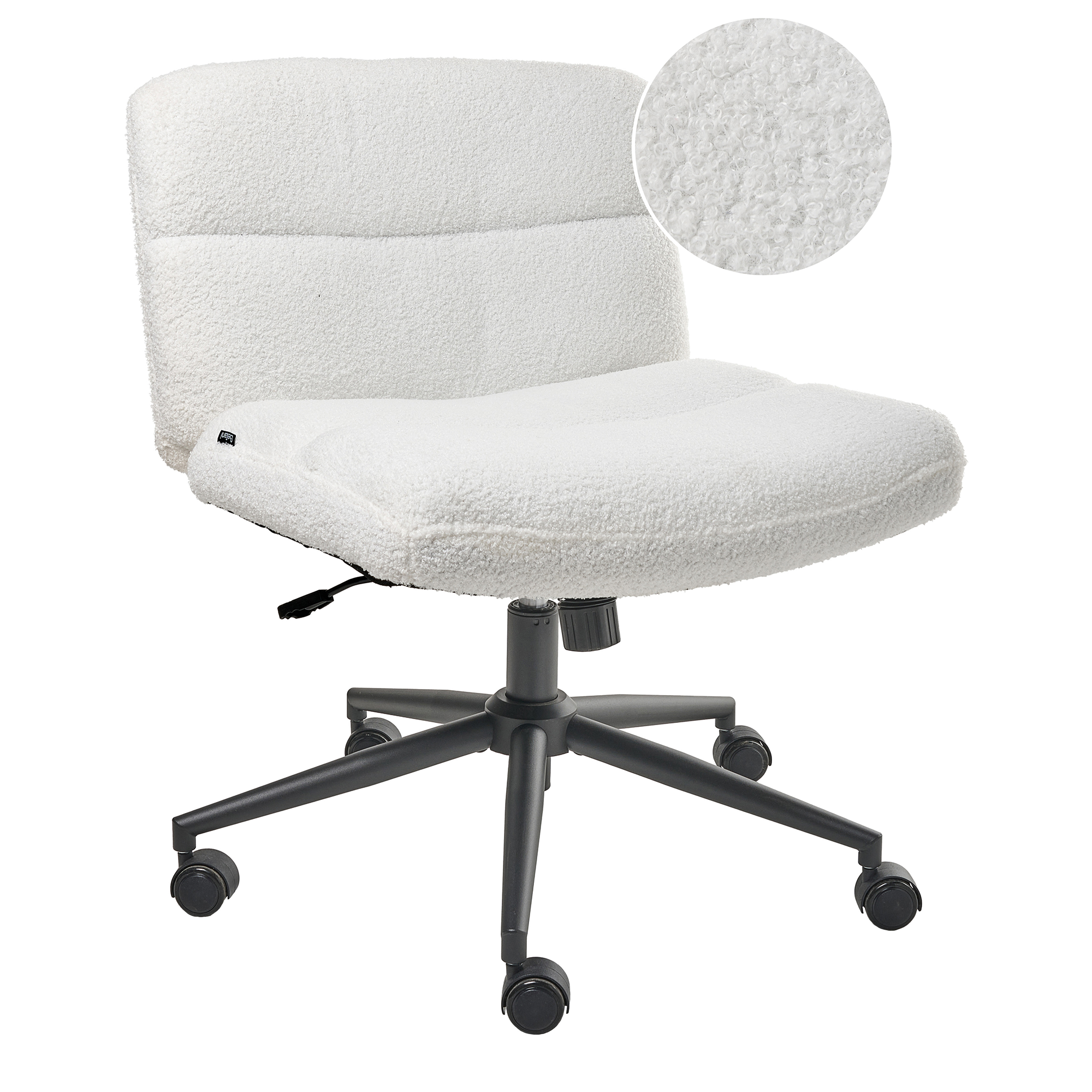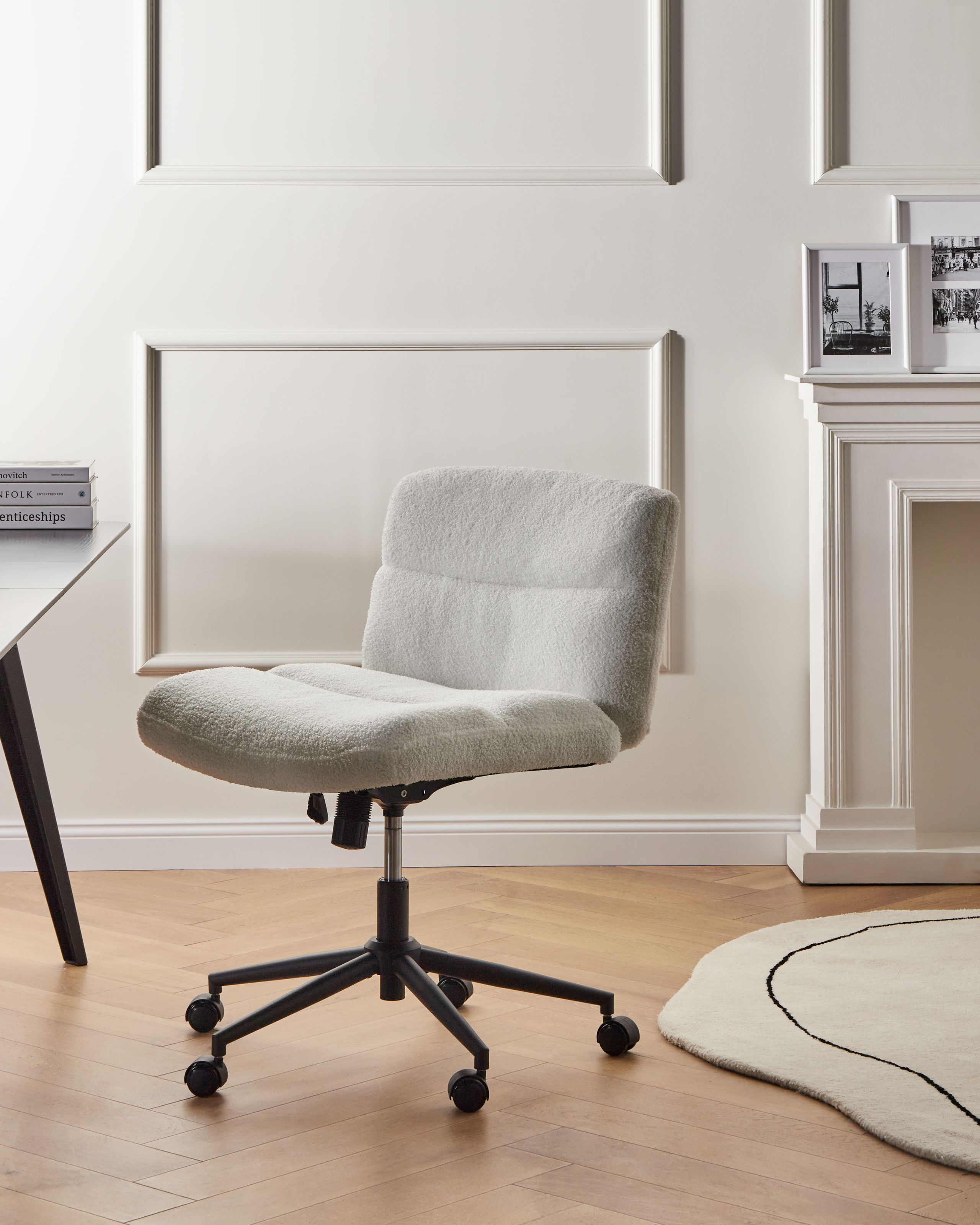 Säädettävä toimistotuoli leveällä istuimella. Tämä tyylikäs työtuoli on täydellinen lisä mihin tahansa kotitoimistoon. Pehmeällä bukleekankaalla verhoiltu tuoli on varustettu pneumaattisella istuinkorkeuden säädöllä ja kääntyy 360 astetta. Leveä istuin, kallistuva selkänoja ja käsinojaton muotoilu mahdollistavat mukavan istumisen vaikkapa jalat ristissä. Hillityn värinsä ansiosta tuoli sopii täydellisesti moniin sisustustyyleihin.