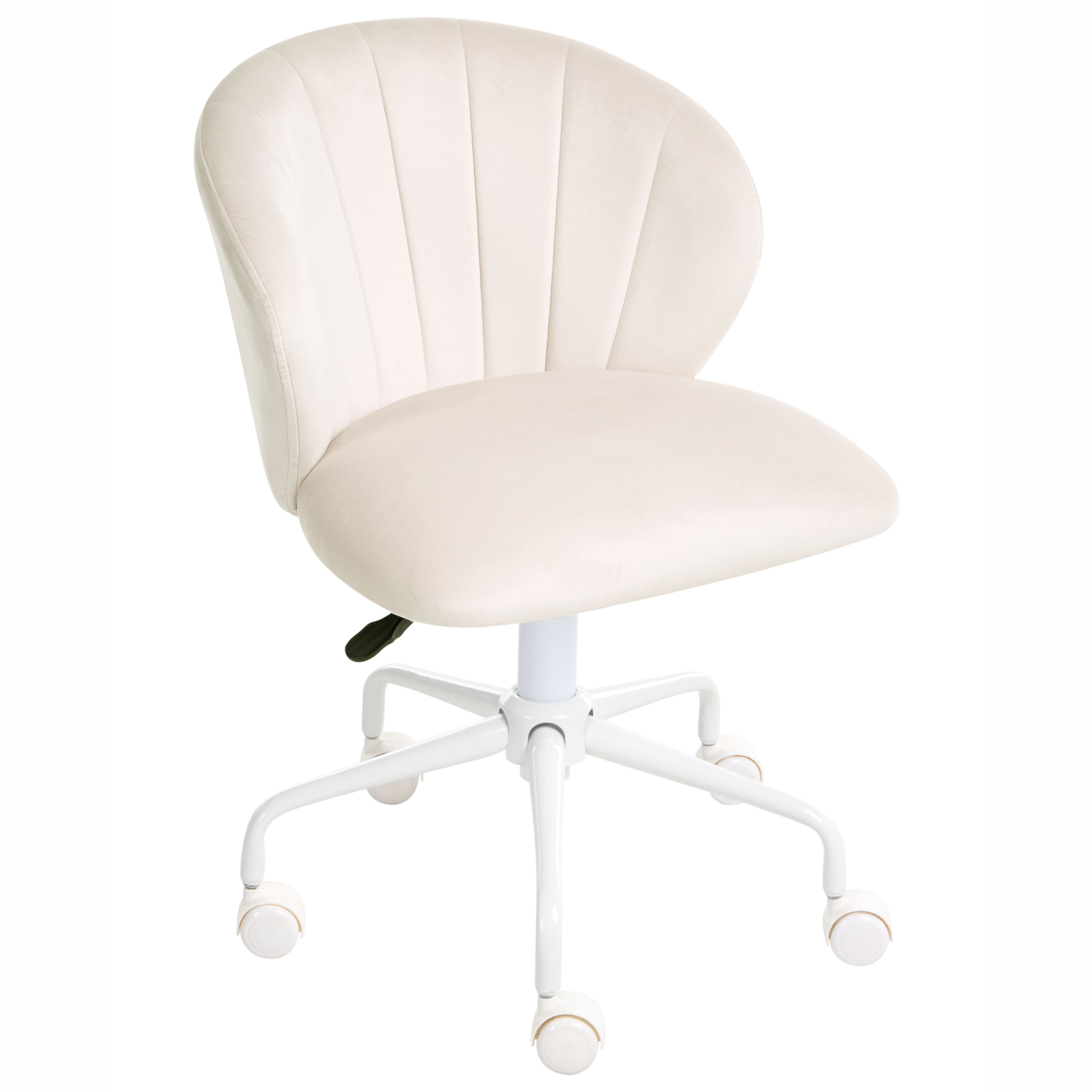 Verhoiltu työtuoli simpukkaselkänojalla. Lisää kotitoimistoon tai teinin huoneeseen ripaus tyyliä tällä suloisella työtuolilla, jota somistaa simpukan muotoinen selkänoja. Pehmeä, kestävä samettiverhoilu varmistaa mukavuuden, kun taas raudasta valmistettu ristikkojalka takaa vakauden. Säädettävän korkeuden ansiosta työtuoli on helppo sovittaa tarpeisiin sopivaksi, ja 360° kääntyvyys sekä sulavasti rullaavat pyörät mahdollistavat sujuvan liikuvuuden. Työtuoli sulautuu vaivattomasti mihin tahansa sisustukseen.