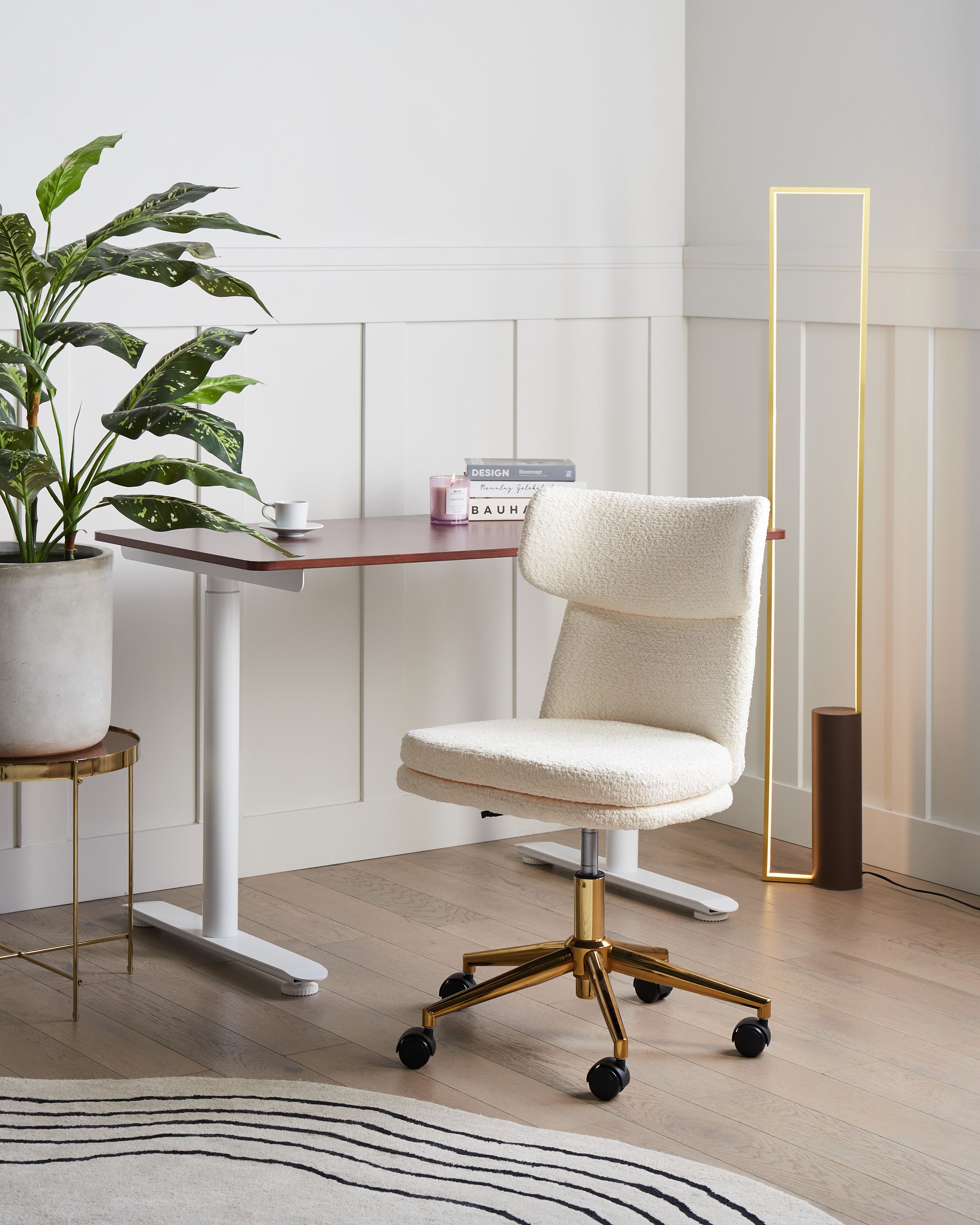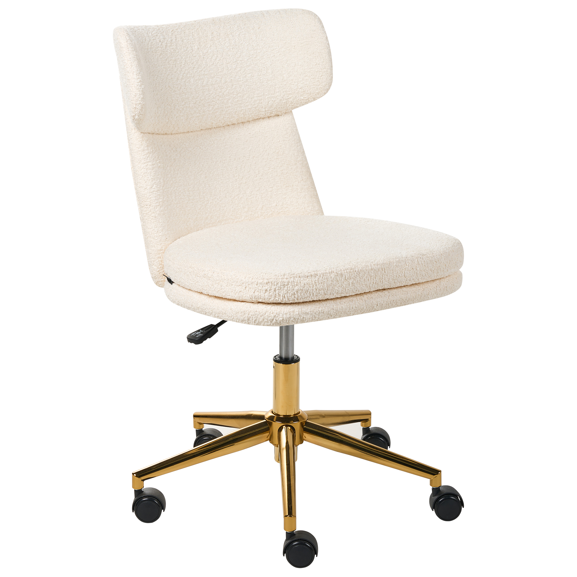 Glamour-tyylinen työtuoli. Tämä muhkealla bukleekankaalla verhoiltu ja lempeästi kaartuva työtuoli luo kutsuvan ja kodikkaan tunnelman. Sen pehmustettu ja mukava istuin, käsinojaton muotoilu ja säädettävä istuinkorkeus tarjoavat toiminnallista eleganssia. Kullanvärisessä, raudasta valmistetussa ristikkojalassa on sulavasti rullaavat pyörät, jotka helpottavat liikkumista. Kallistusominaisuus ja täysi kääntyvyys kohottavat käyttömukavuutta. Työtuoli on täydellinen lisä kotitoimistoon tai huoneisiin, joissa kaivataan tyylikästä ja mukavaa istumapaikkaa.