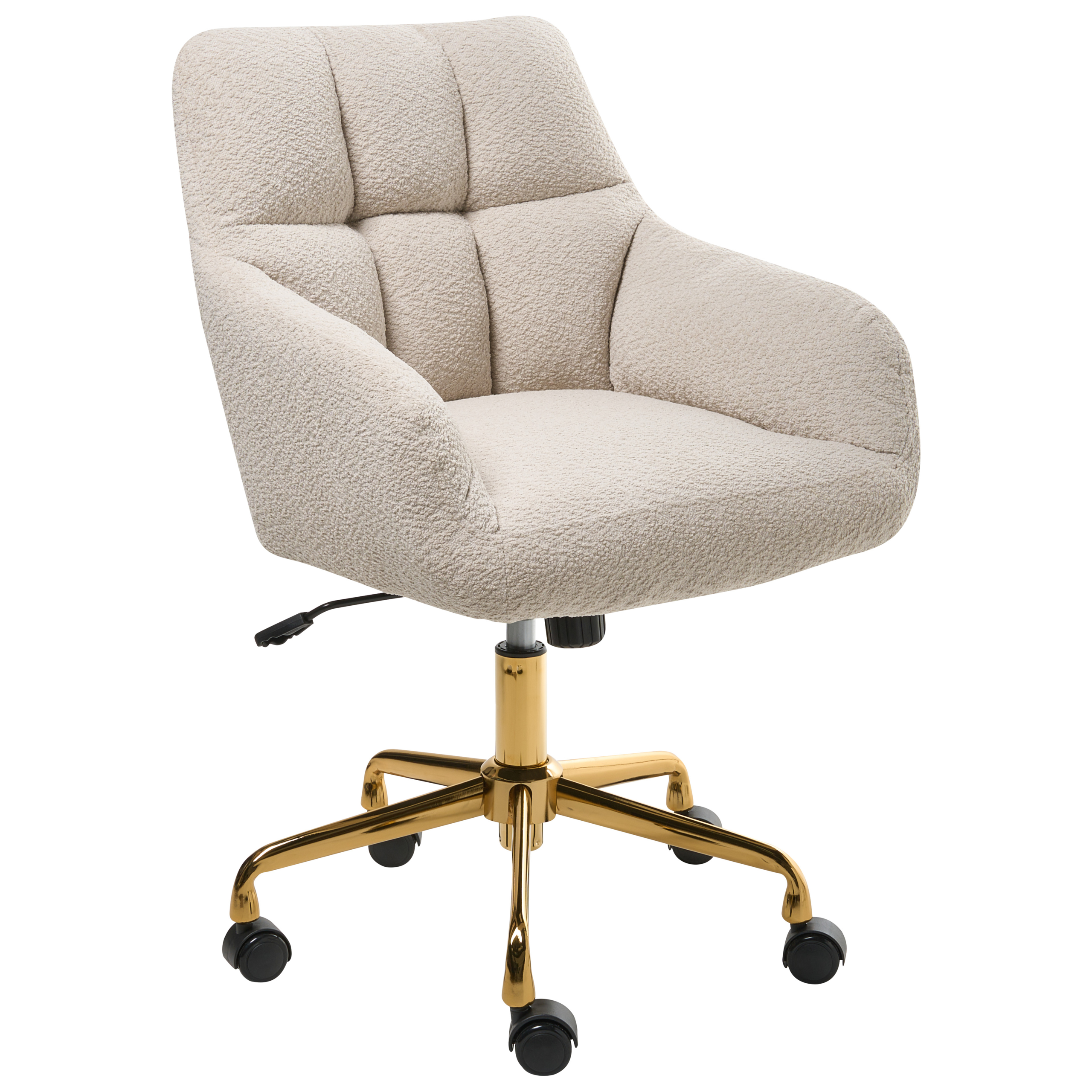 Paksusti pehmustettu työtuoli. Tämä työtuoli on erinomainen monikäyttöinen lisä, joka kohottaa tehokkuutta pitkien työpäivien aikana. Se on verhoiltu pehmeällä bukleekankaalla, jota täydentää kestävästä kullanvärisestä teräksestä valmistettu ristikkojalka. Tukevat käsinojat, täysi kääntyvyys, säädettävä korkeus ja kallistusmekanismi tekevät tuolista mukavan ja toiminnallisen valinnan, joka on helppo räätälöidä tarpeisiin sopivaksi. Hurmaava vaaleanbeige sävy sulautuu vaivattomasti monenlaisiin sisustuksiin.