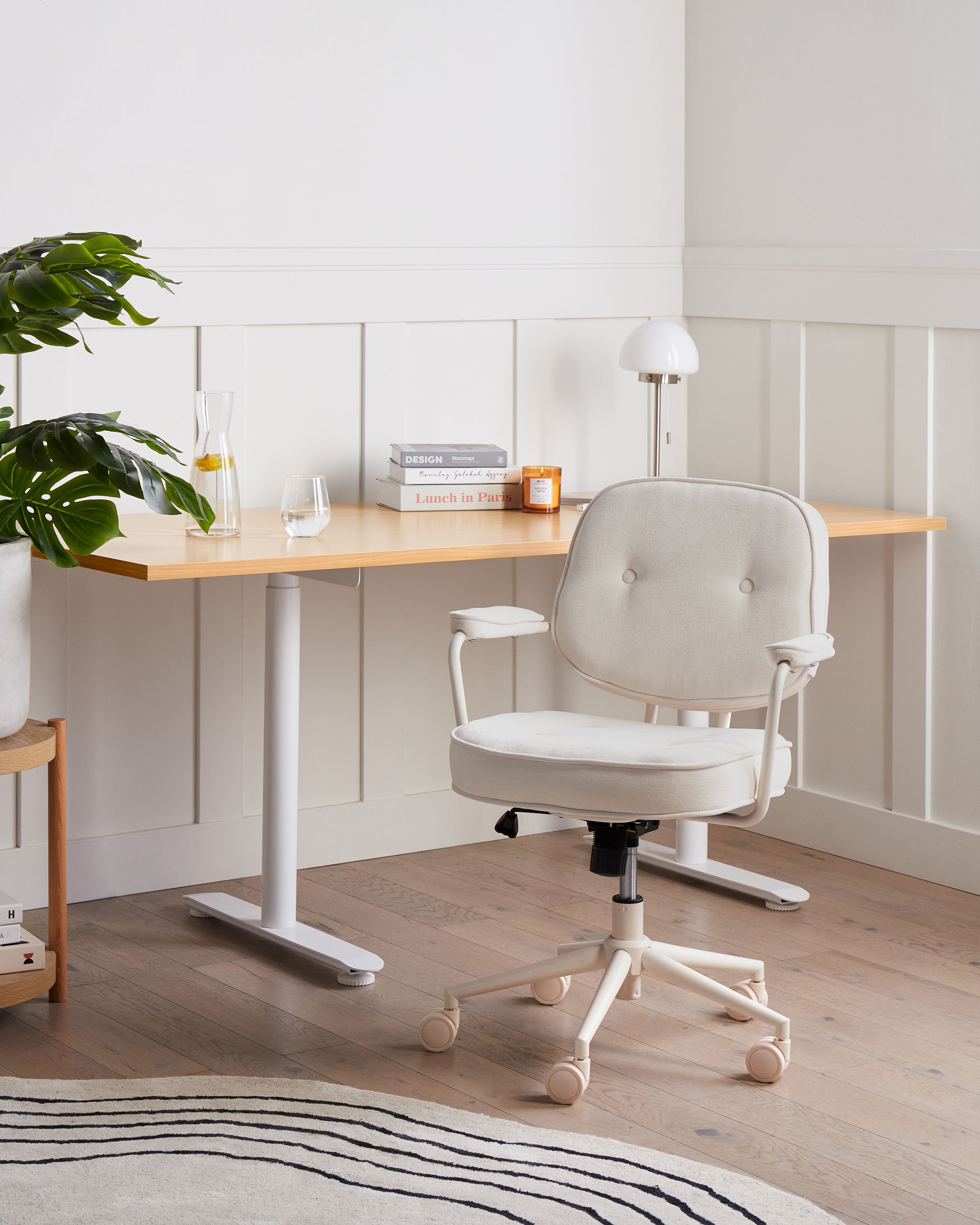 Retrotyylinen pehmustettu toimistotuoli käsinojilla. Tämä tyylikäs työtuoli yhdistää retrohenkisen muotoilun moderniin mukavuuteen ja toiminnallisuuteen. Sileällä luonnonvalkoisella kankaalla verhoiltu tuoli luo hienostuneen ilmeen, joka on helppo ylläpitää. Korkeussäädettävä istuin, kääntyvä jalusta ja pehmeästi pyörivät pyörät tarjoavat erinomaisen liikkuvuuden, mukautuen mihin tahansa työtilaan. Pehmustettu istuin, tukeva selkänoja ja vankka metallirunko takaavat sekä mukavuuden että kestävyyden pitkiä työpäiviä varten.