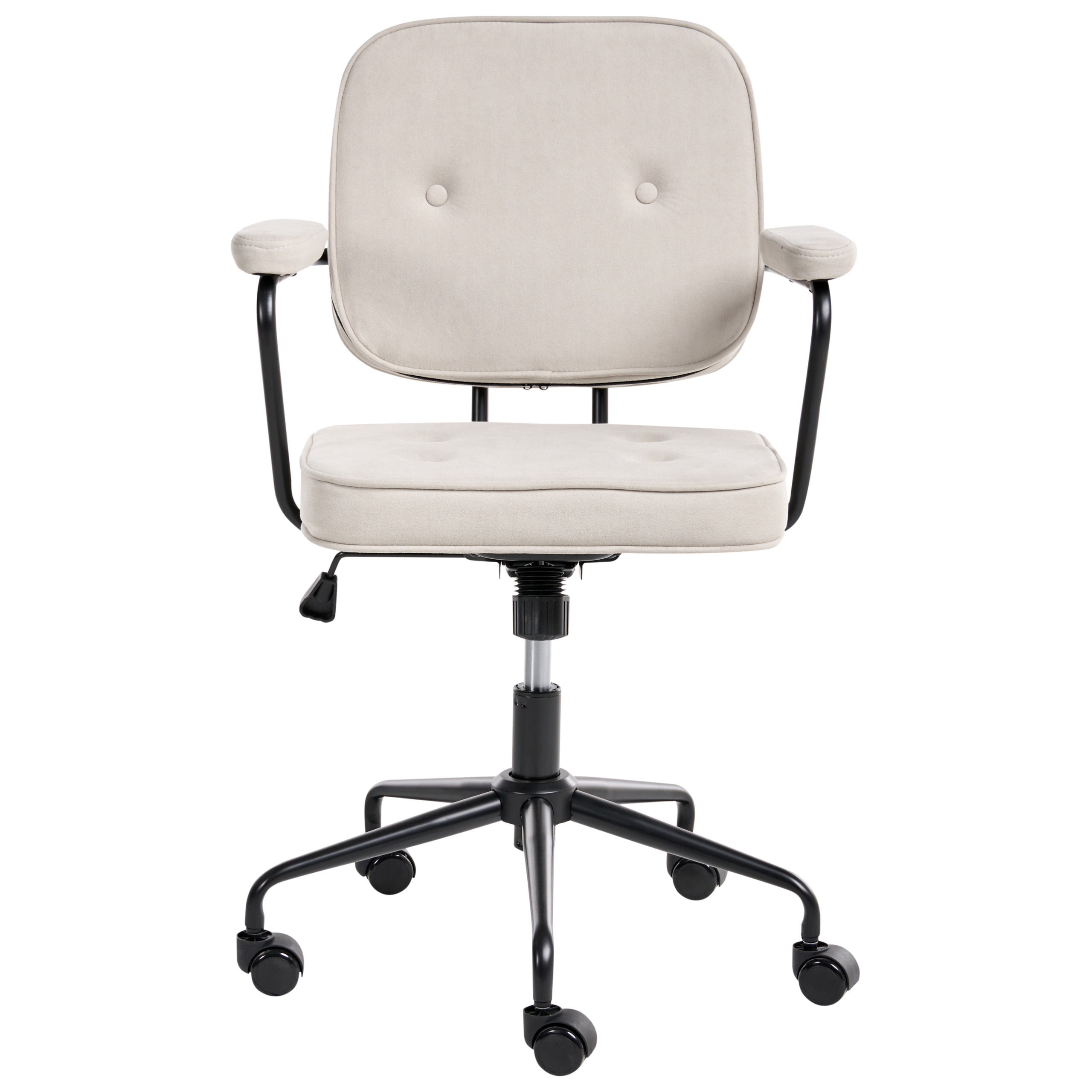 Retrotyylinen säädettävä työtuoli. Päivitä kotitoimistoa tällä käytännöllisellä työtuolilla. Kestävällä samettikankaalla verhoiltu tuoli on viimeistelty tyylikkäällä nappituftauksella, pehmustetuilla käsinojilla ja muhkealla istuimella, joka takaa istumamukavuuden. Kaasunostimella toimiva korkeudensäätö on helppo asettaa tarpeisiin sopivaksi. Siinä on myös 360° kääntyvyys, kallistusmekanismi ja pehmeästi rullaavat pyörät, jotka tekevät liikkumisesta vaivatonta. Jauhemaalatusta raudasta valmistettu ristikkojalka takaa vakauden ja kestävyyden. Retrovaikutteinen muotoilu saa työtuolin sopimaan erinomaisesti sekä moderniin että perinteiseen sisustukseen.