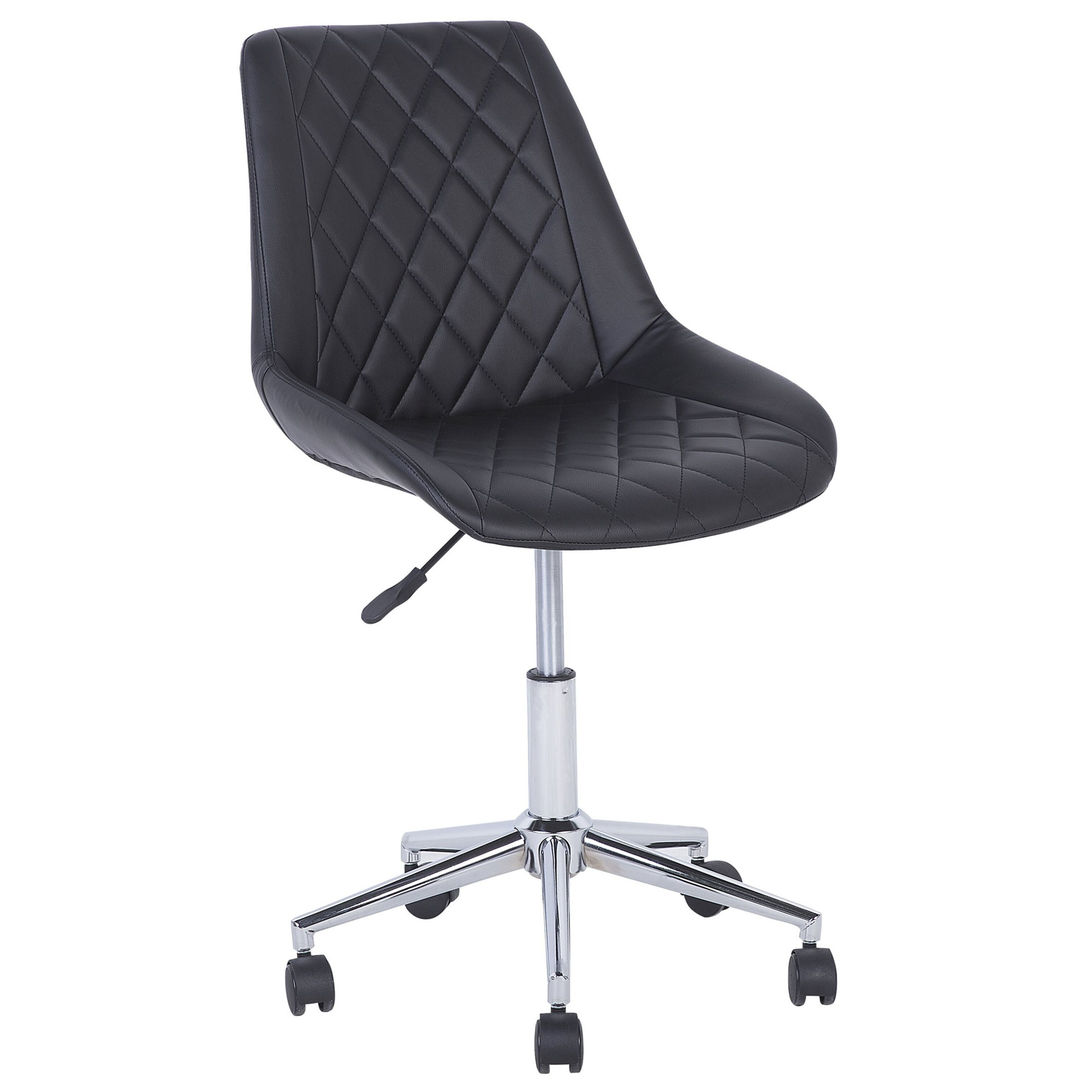 Käsinojaton säädettävä toimistotuoli. Lisää tyyliä kotitoimistoosi. Keinonahalla verhoiltu työtuoli korostaa saumattomasti perinteisen, modernin tai glamour-tyylin sisustusta. Mustan verhoilun koristeelliset timanttitikkaukset yhdessä kiiltävän hopean rungon kanssa luovat kappaleen, joka sopii useisiin tyyleihin ja värimaailmoihin. Pyörillä varustetussa tuolissa on korkeudensäätö sekä pehmeä vaahtomuovitäyte, joka takaa mukavan istuvuuden pitkien työpäivien aikana.