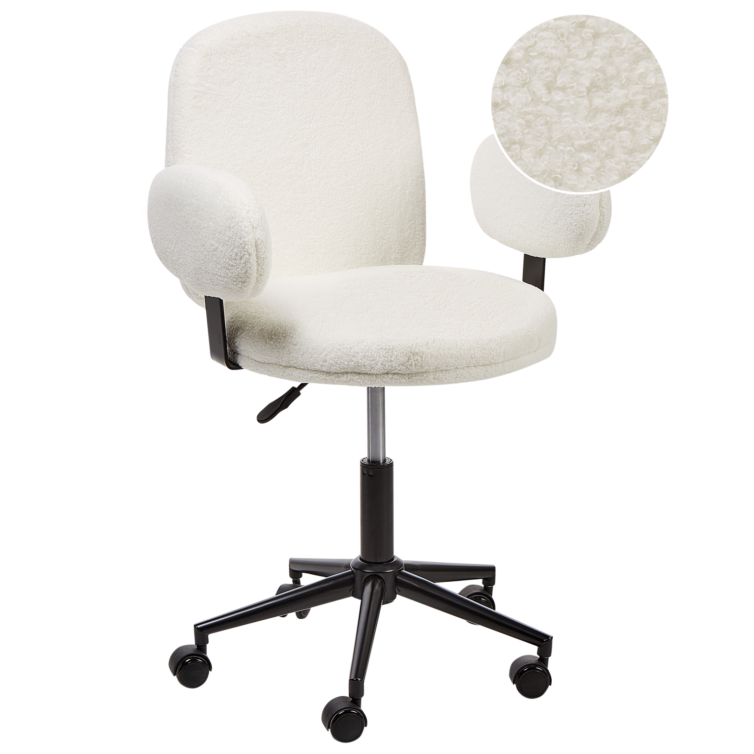 Muhkea työtuoli käsinojilla. Luo viihtyisä tunnelma työtilaasi tällä mukavalla työtuolilla. Istuin, selkänoja ja käsinojat on verhoiltu pehmeällä, kauniin luonnonvalkoisen sävyisellä bukleekankaalla. Klassinen musta ristikkojalusta, joka on valmistettu raudasta, takaa vakauden ja on varustettu sulavasti rullaavilla pyörillä. Kaasunostimen ansiosta tuolin korkeutta on helppo säätää tarpeen mukaan, ja 360° kääntötoiminto tekee siitä loistavan lisän mihin tahansa huoneeseen.