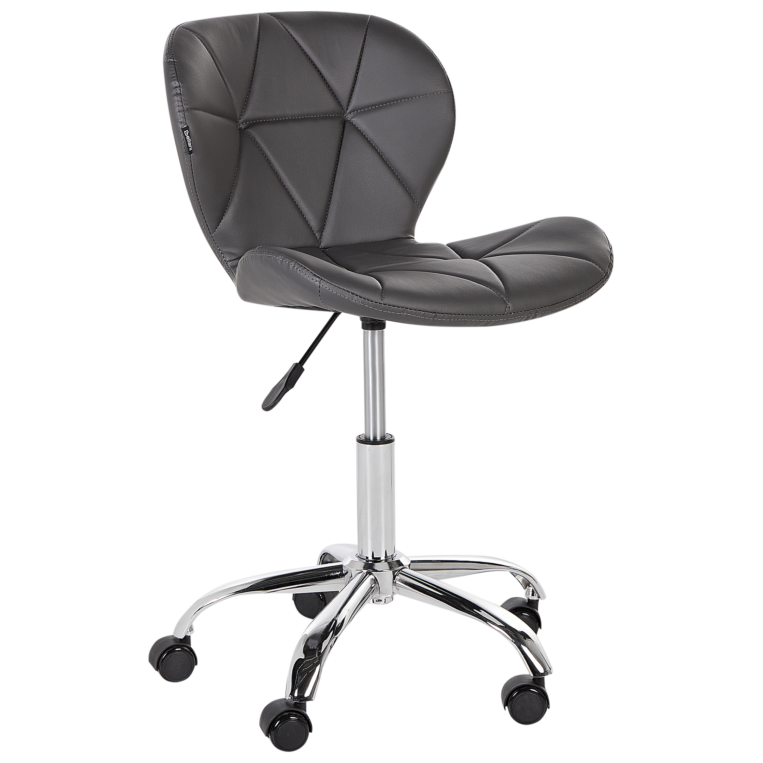 Timanttitikattu työtuoli kotitoimistoon. Lisää tyyliä työtilaasi tällä elegantilla työtuolilla. Modernin muotoilunsa ja universaalin värinsä ansiosta tuoli sopii saumattomasti erilaisiin sisustustyyleihin ja värimaailmoihin. Paksusti pehmustettu ja hyvin profiloitu istuinosa tarjoaa mukavuutta ja on verhoiltu laadukkaalla keinonahalla. Toimistotuolia on mahdollista kääntää 360°, ja sen korkeutta voidaan säätää kaasunostimella. Tukeva rautaristikkojalusta on varustettu sulavasti rullaavilla pyörillä. Tyylikäs tikkaus kohottaa tuolin ilmettä, tehden siitä hienostuneen lisän mihin tahansa tilaan.