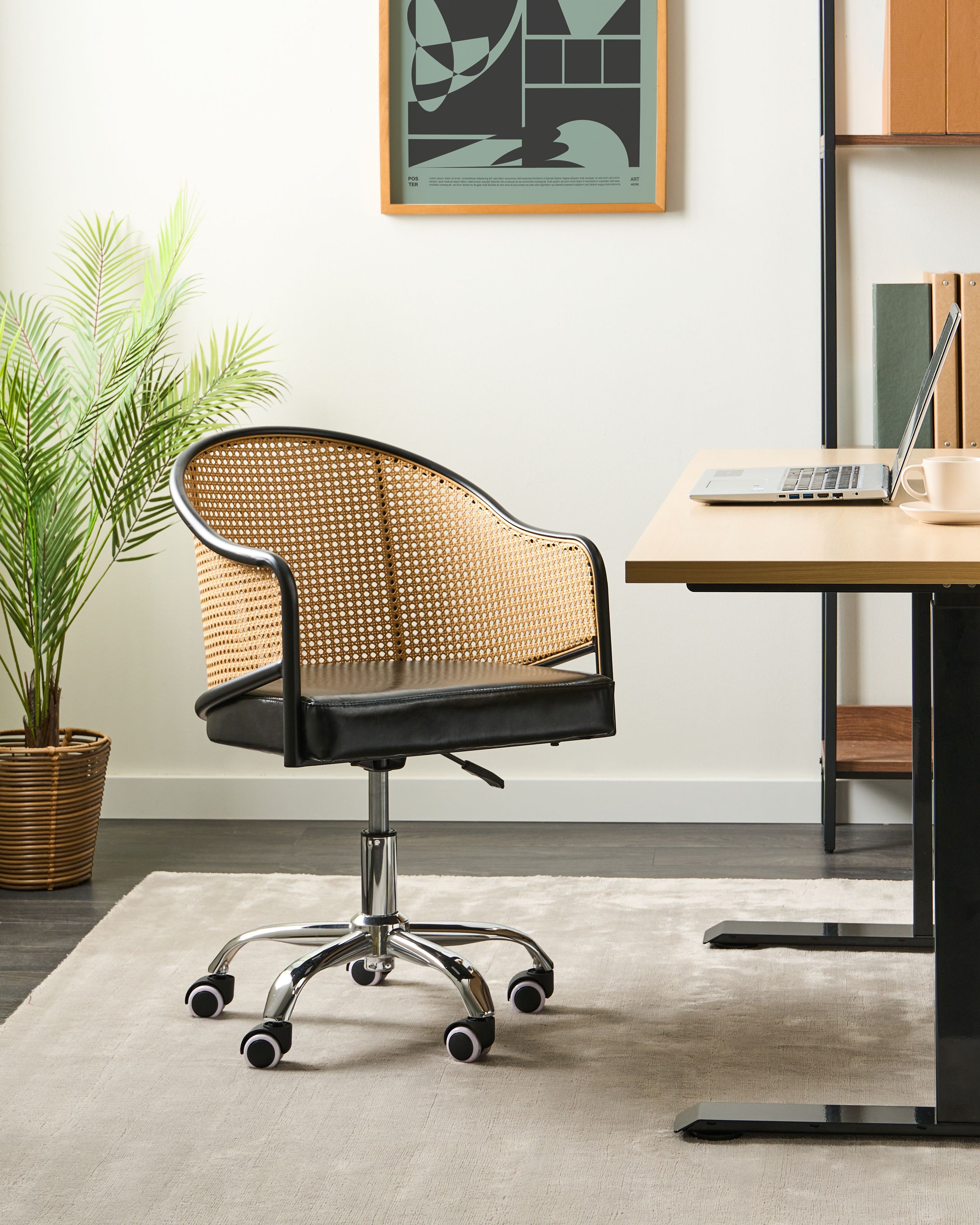 Retrotyylinen pyörivä toimistotuoli wieniläispunoksella. Tuo toimistoon lämmintä, luonnollista ilmettä tällä tyylikkäällä työtuolilla, jossa on pehmeä, klassisen musta keinonahkaistuin. Kevyesti kaartuvassa selkänojassa on ilmava, polyrottingista valmistettu wieniläispunos, joka tuo keveyttä ja hienostuneisuutta. Tukeva kromattu tähtijalka on varustettu pneumaattisella istuinkorkeuden säädöllä ja pehmeästi pyörivillä pyörillä, joissa on turvajarrutoiminto. Työtuoli on suunniteltu tarjoamaan sekä mukavuutta että eleganttia estetiikkaa, joka kohottaa mitä tahansa työtilaa.