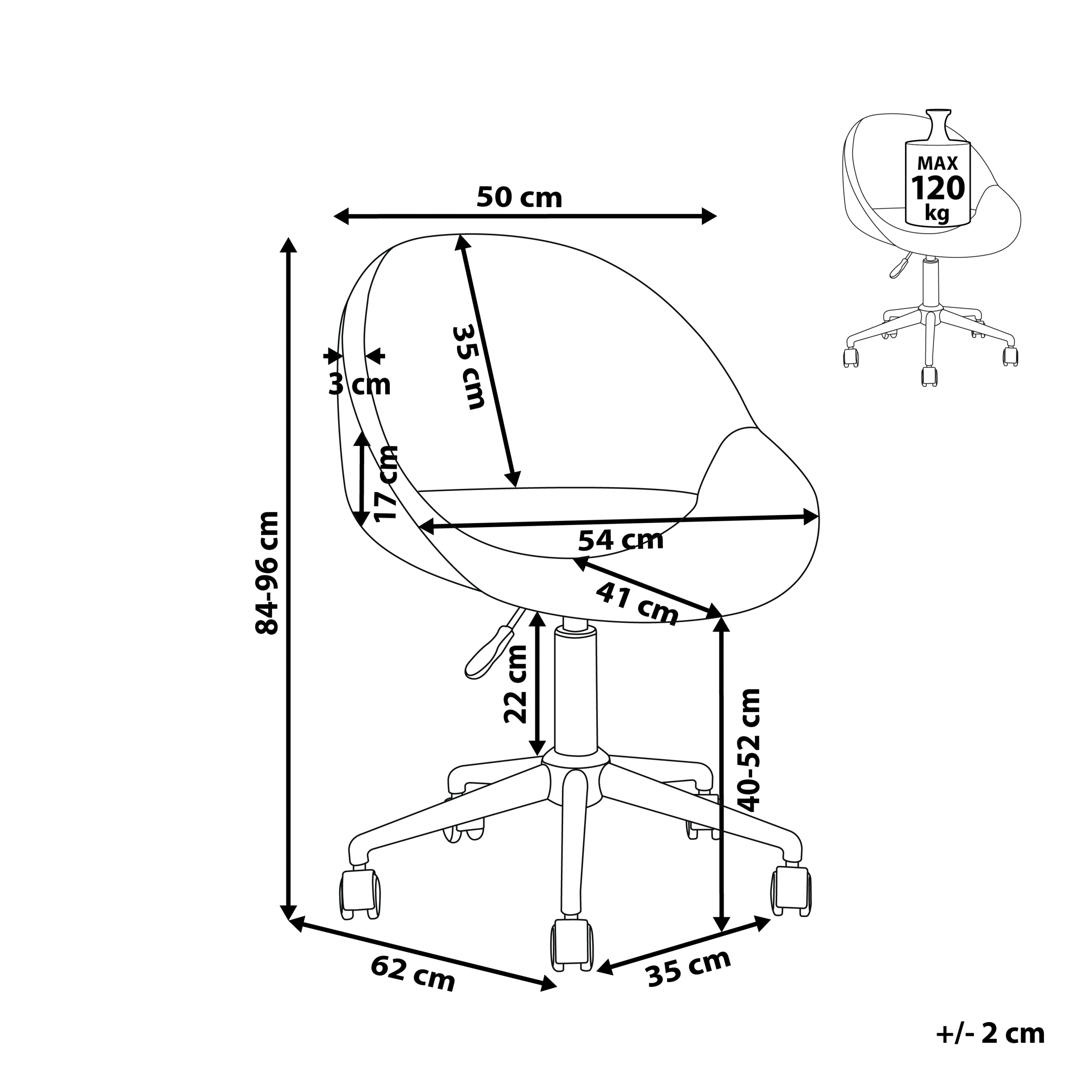 Ominaisuudet: Tasaisesti rullaavat pyörät, 360° kääntyvä, Pneumaattinen istuinkorkeuden säätö, Turvajarrutoiminto lukitsee pyörät turvallisuuden varmistamiseksi ja avaa lukituksen liikkuvuuden mahdollistamiseksi, Tuo tyyliä sisustukseen, Silkkisen sileä, samettinen kangas