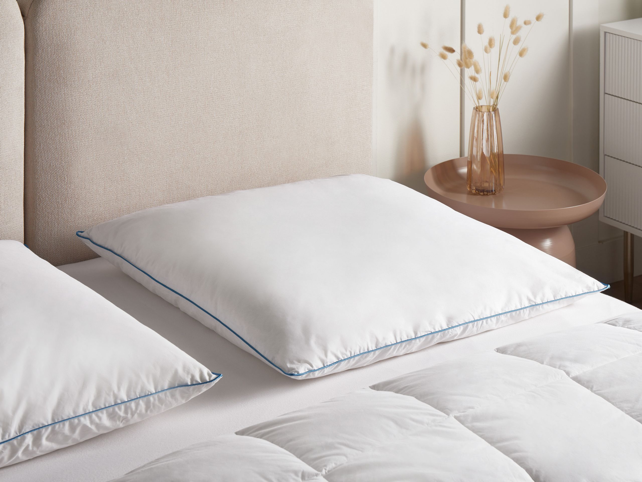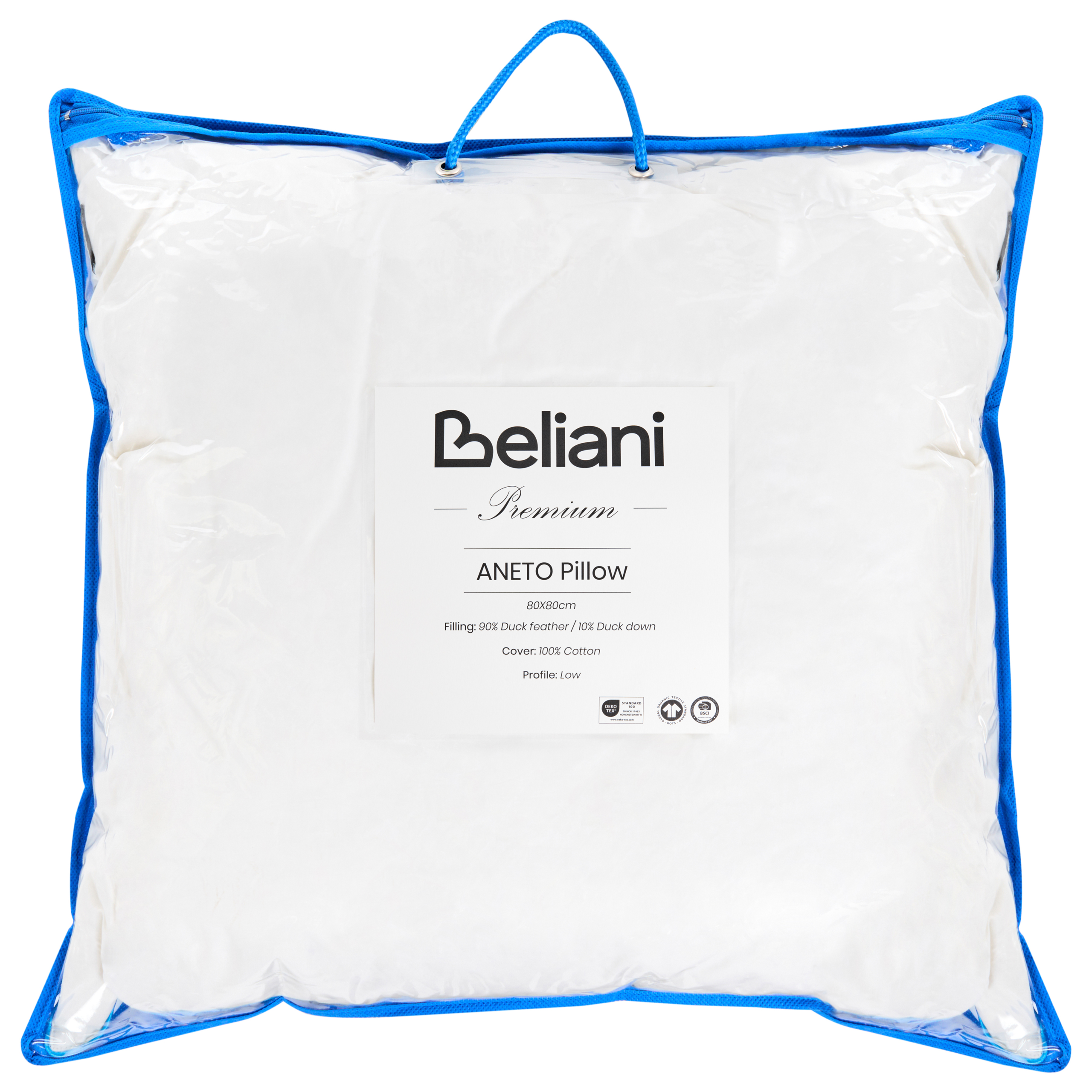 Luonnontäytteinen tyyny. Nauti todella levollisesta unesta tällä ylellisesti täytetyllä matalalla tyynyllä, joka on suunniteltu parantamaan yöunen laatua. Tyyny on täytetty enimmäkseen ankanhöyhenillä ja ripauksella ankanuntuvaa, mikä takaa miellyttävän tuntuman. Puuvillasta valmistettu päällinen on viimeistelty tyylikkäällä sinisellä reunalla, joka lisää aavistuksen eleganssia. Tyyny sopii erinomaisesti kyljellään ja selällään nukkujille, tarjoten pehmeää tukea koko yön ajan. Puhtaiden, hengittävien materiaalien ansiosta se on luonnostaan allergiaystävällinen ja tarjoaa tasapainon mukavuuden ja helpon ylläpidon välillä.