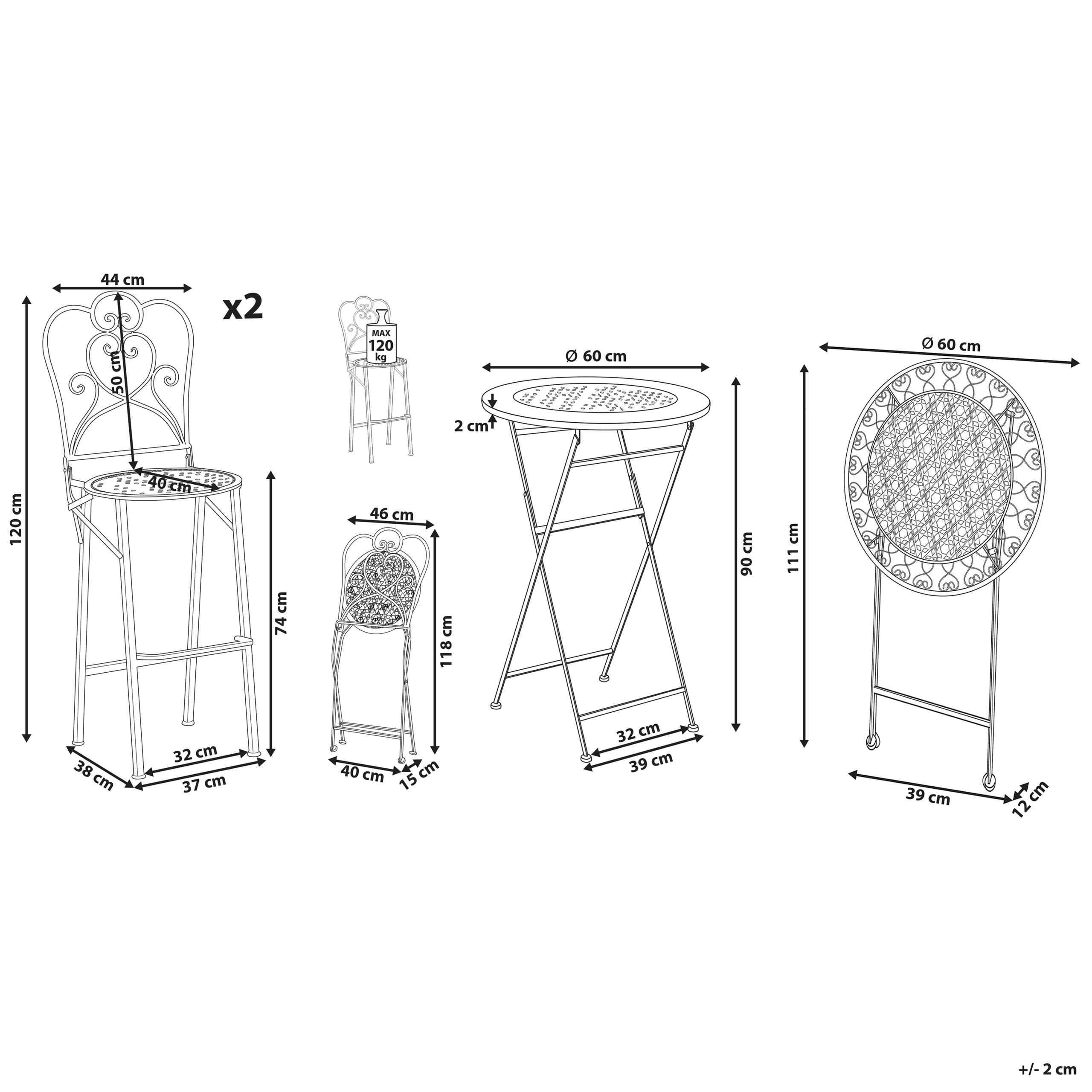 Retro kokoontaitettava baariryhmä puutarhaan. Nauti auringosta ja raikkaista juomista tämän tyylikkään ulkobaariryhmän ääressä. Vankat rungot on valmistettu jauhemaalatusta raudasta, joka takaa kestävyyden ja pitkäikäisyyden. Romanttisen ranskalaistyylin inspiroima muotoilu ja kauniit filigraanikuviot antavat kalusteille ylellisen ilmeen, joka sopii moniin erilaisiin ulkosisustuksiin. Neutraalin värinsä ja kuluneen viimeistelynsä ansiosta setti on helppo yhdistää monien eriväristen tekstiilien kanssa. Lisäksi kalusteet ovat kokoontaitettavissa, joten ne on helppo varastoida käyttökauden päätyttyä.