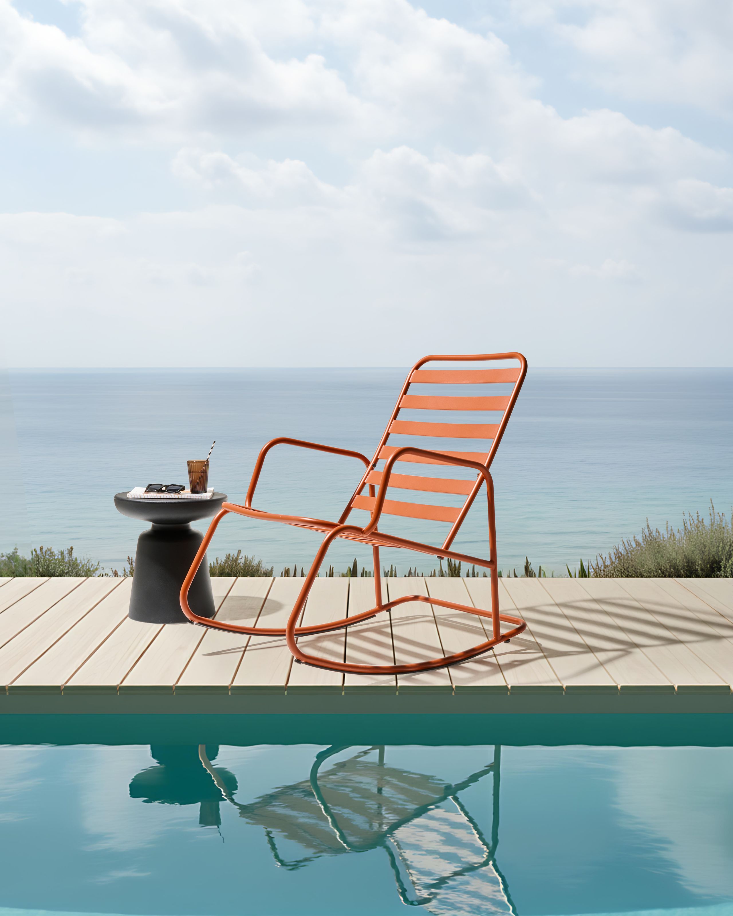 Moderni puutarhan keinutuoli. Tämä elegantti, alumiinista valmistettu ulkokeinutuoli yhdistää nykyaikaisen muotoilun ja kestävän mukavuuden. Kevyt mutta kestävä runko kestää ruostetta ja erilaisia sääolosuhteita, mikä tekee siitä täydellisen rentoutumispaikan terassille tai uima-altaan läheisyyteen. Keinutuolin puhtaat linjat ja lämmin viimeistely täydentävät vaivattomasti mitä tahansa modernia ulkotilaa. Se tarjoaa pehmeän, lempeän keinumisen, jolloin rentoutumisesta voi nauttia tyylillä.