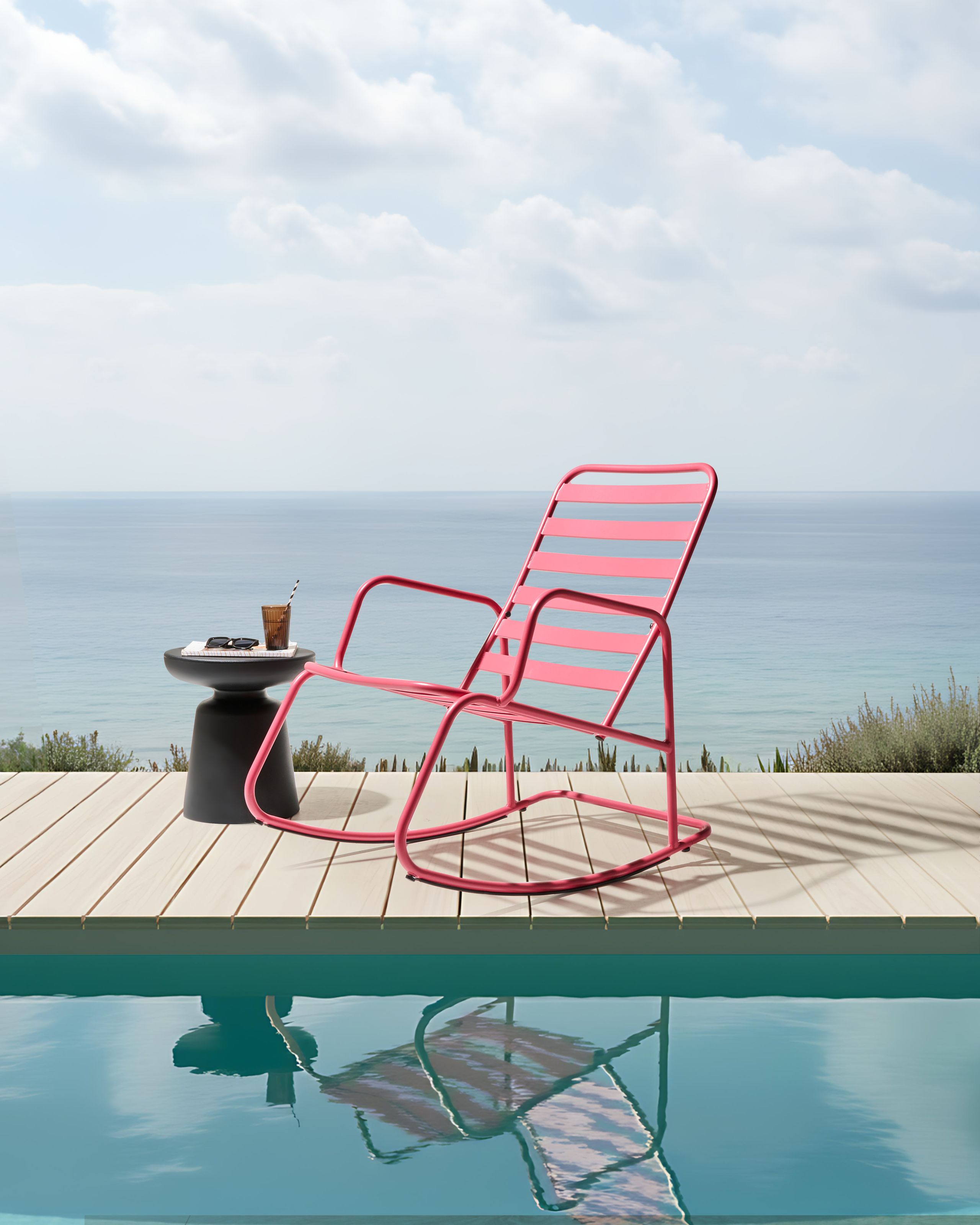 Moderni puutarhan keinutuoli. Tämä elegantti, alumiinista valmistettu ulkokeinutuoli yhdistää nykyaikaisen muotoilun ja kestävän mukavuuden. Kevyt mutta kestävä runko kestää ruostetta ja erilaisia sääolosuhteita, mikä tekee siitä täydellisen rentoutumispaikan terassille tai uima-altaan läheisyyteen. Keinutuolin puhtaat linjat ja eloisa viimeistely täydentävät vaivattomasti mitä tahansa modernia ulkotilaa. Se tarjoaa pehmeän, lempeän keinumisen, jolloin rentoutumisesta voi nauttia tyylillä.