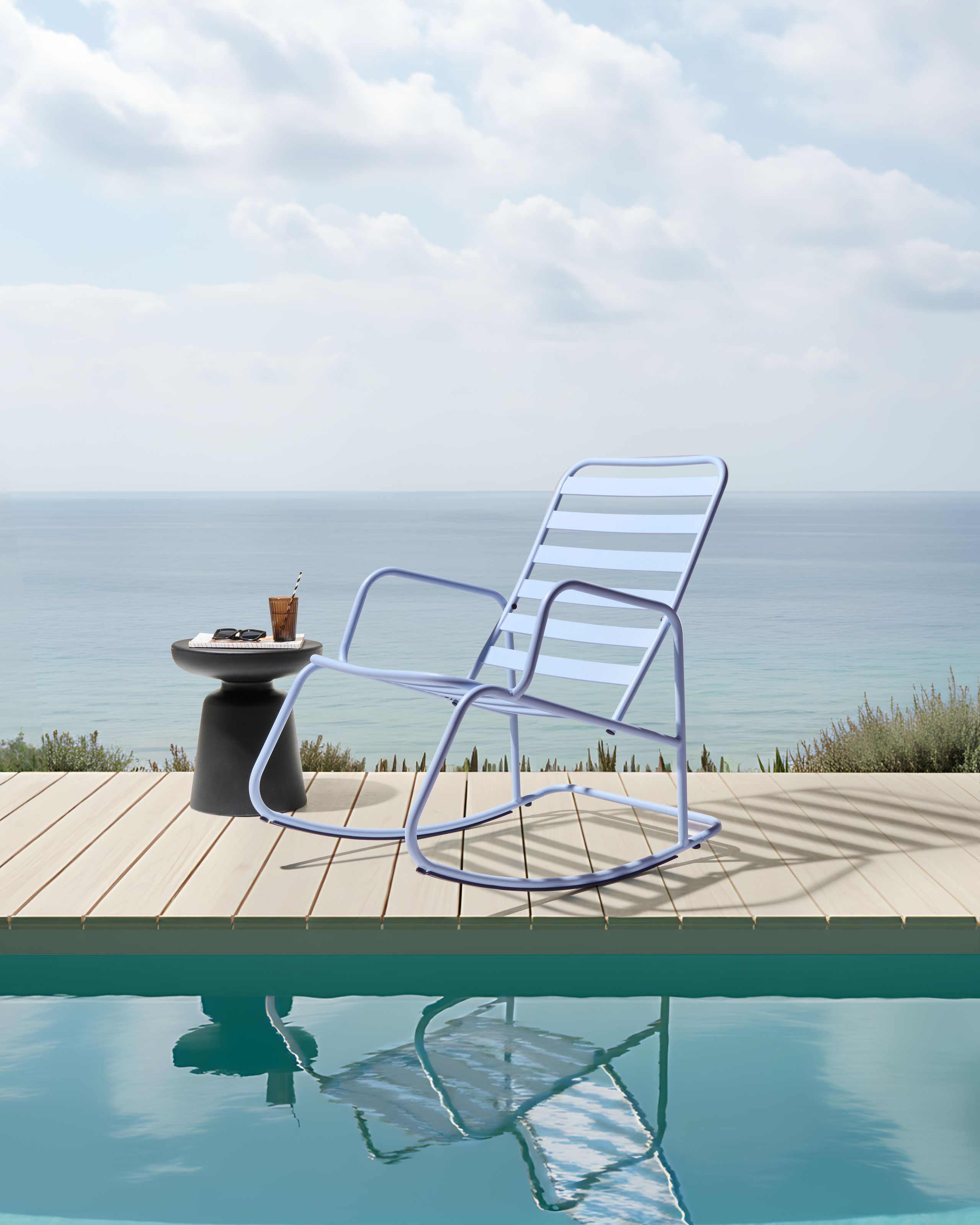 Moderni puutarhan keinutuoli. Tämä elegantti, alumiinista valmistettu ulkokeinutuoli yhdistää nykyaikaisen muotoilun ja kestävän mukavuuden. Kevyt mutta kestävä runko kestää ruostetta ja erilaisia sääolosuhteita, mikä tekee siitä täydellisen rentoutumispaikan terassille tai uima-altaan läheisyyteen. Keinutuolin puhtaat linjat ja raikas viimeistely täydentävät vaivattomasti mitä tahansa modernia ulkotilaa. Se tarjoaa pehmeän, lempeän keinumisen, jolloin rentoutumisesta voi nauttia tyylillä.