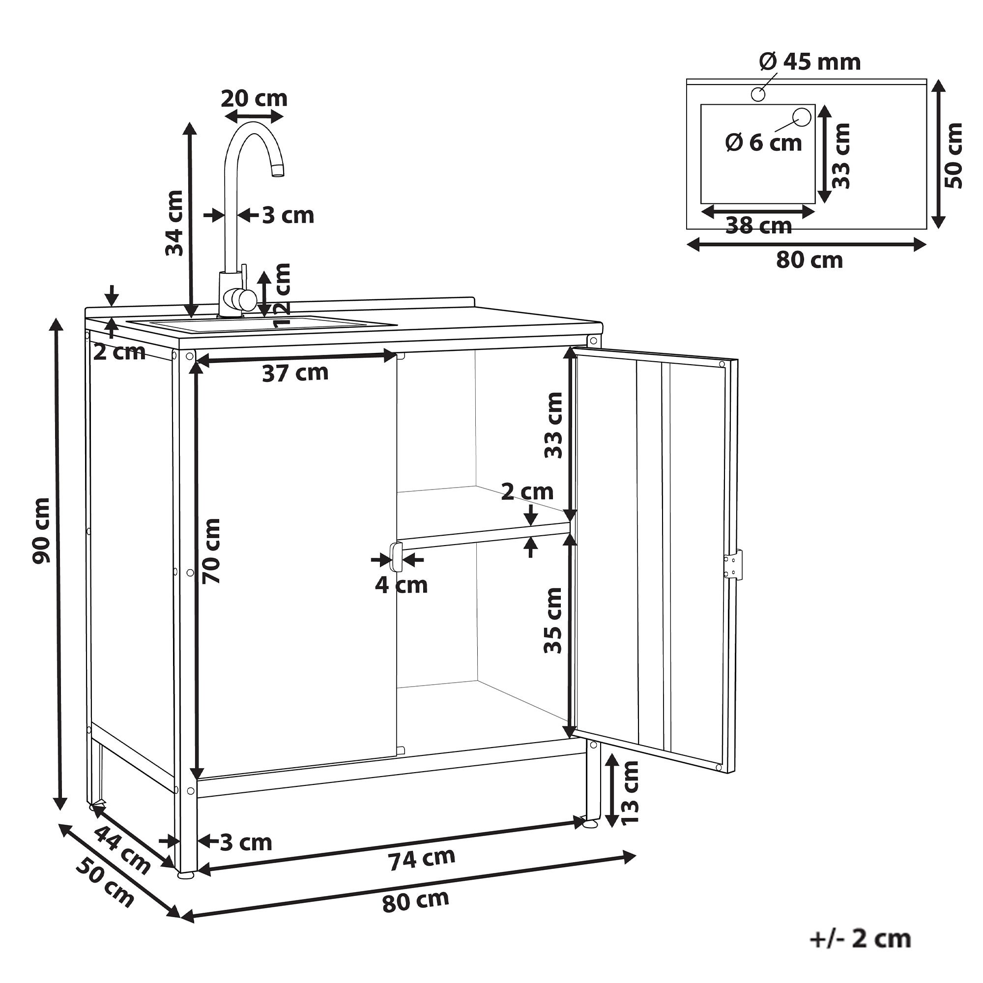 Moderni ulkokeittiökaappi pesualtaalla ja ruostumattomalla terästasolla. Tämä kätevä ulkokeittiön allaskaappi on täydellinen lisä, joka tuo modernia ilmettä jokaiseen ulkokeittiöön. Kaapissa on kaksi ovea ja kaksi hyllyä, jotka sopivat mainiosti tarvikkeiden säilyttämiseen. Sen avulla voit jatkaa keskustelua vieraiden kanssa myös ruokaa valmistaessasi, sillä sinun ei tarvitse vetäytyä sisälle keittiöön. Runko on valmistettu teräksestä ja taso ruostumattomasta teräksestä, mikä takaa allaskaapin kestävyyden ja erinomaisen soveltuvuuden ulkokäyttöön. Käytännölliseen rakenteeseen kuuluu pesuallas hanalla sekä tilava taso, joka sopii täydellisesti ainesten valmisteluun tai grilliasemana käytettäväksi.