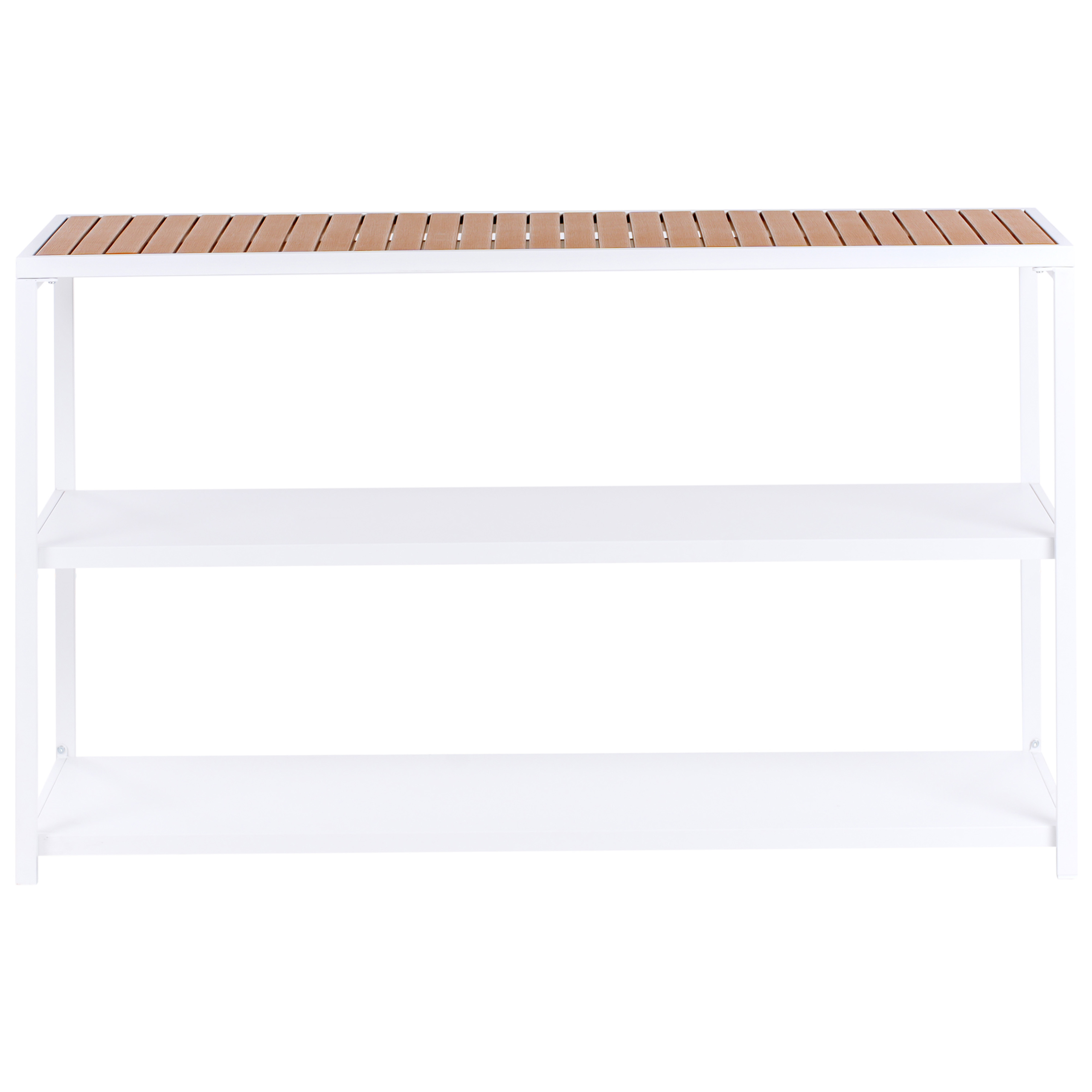 Moderni keittiösaareke avohyllyillä puutarhaan. Lisää ulkotilaan toiminnallisuutta tällä ulkokeittiön saarekkeella. Tukevasta, mattavalkoisesta teräksestä valmistettu runko huokuu nykyaikaista eleganssia. Kestävä muovipuutaso tarjoaa runsaasti tilaa ruoanvalmistukseen. Kahdelle avohyllylle mahtuvat niin astiat, koristeet kuin keittiötarvikkeetkin. Saareke sopii erinomaisesti grilliruokien valmisteluun, samalla kun viihdytät vieraita.