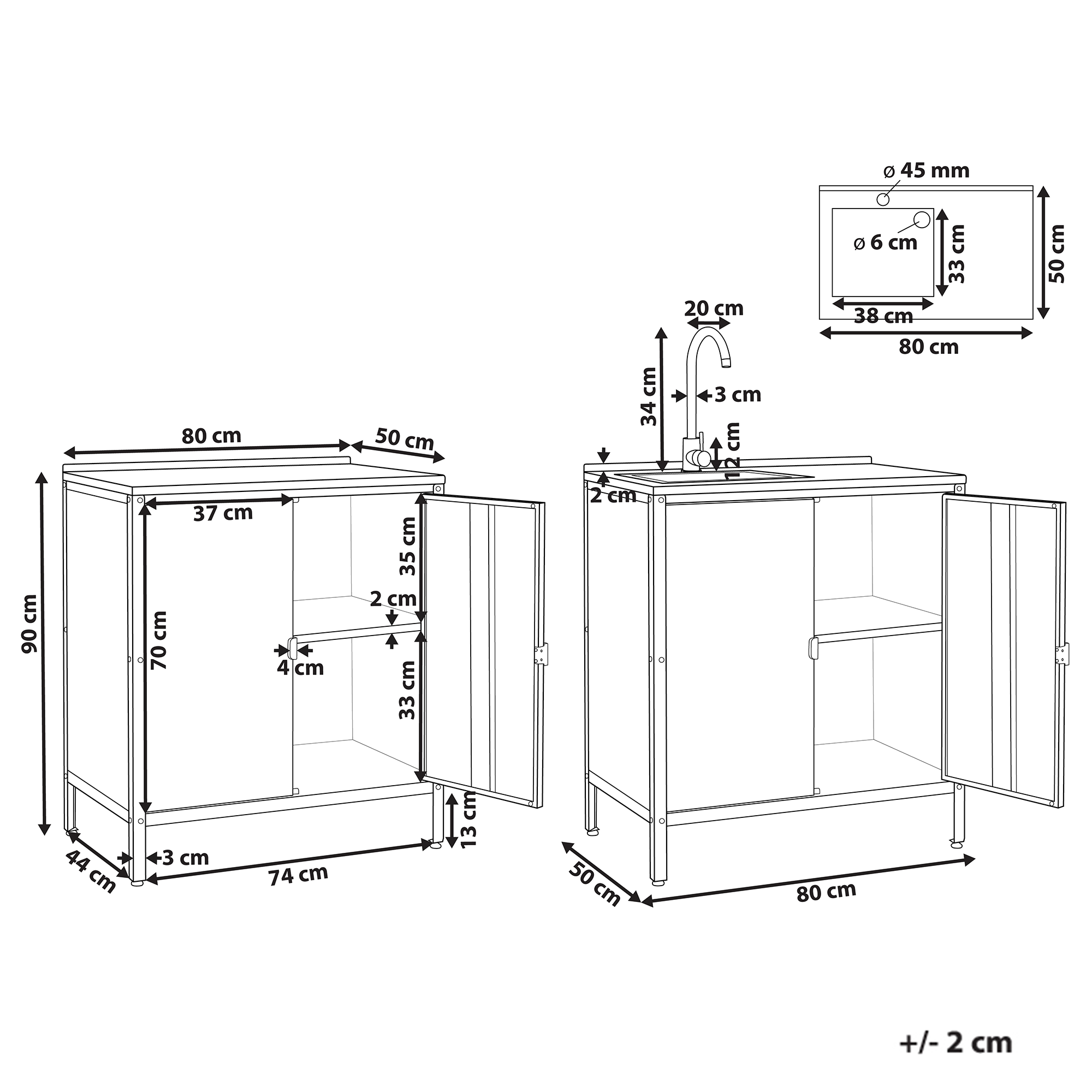 Hintaan sisältyy: 1 x Kaappi pesualtaalla, 1 x Kylmän ja kuuman veden letkut, 1 x Tyhjennysputki, 1 x Hana, 1 x Kaappi