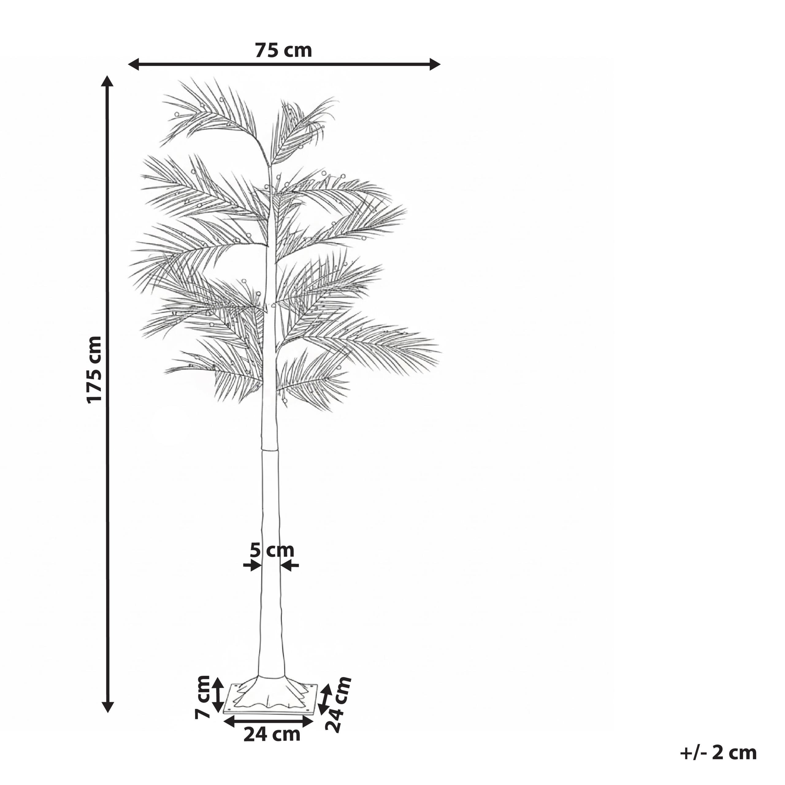Koristeellinen LED-valopuu sisä- ja ulkokäyttöön. Tuo sisustukseen jouluista tunnelmaa tällä kauniisti valmistetulla tekopalmulla, jossa on lämpimän valkoiset LED-valot. Se sopii täydellisesti joulusesonkiin, tuoden tilaan pehmeän hehkun ja trooppisen viehätyksen, olipa se sisällä tai ulkona. Realistinen muotoilu ja helppo asennus tekevät siitä ainutlaatuisen ja helppohoitoisen lisän tyylikkääseen joulusisustukseen.