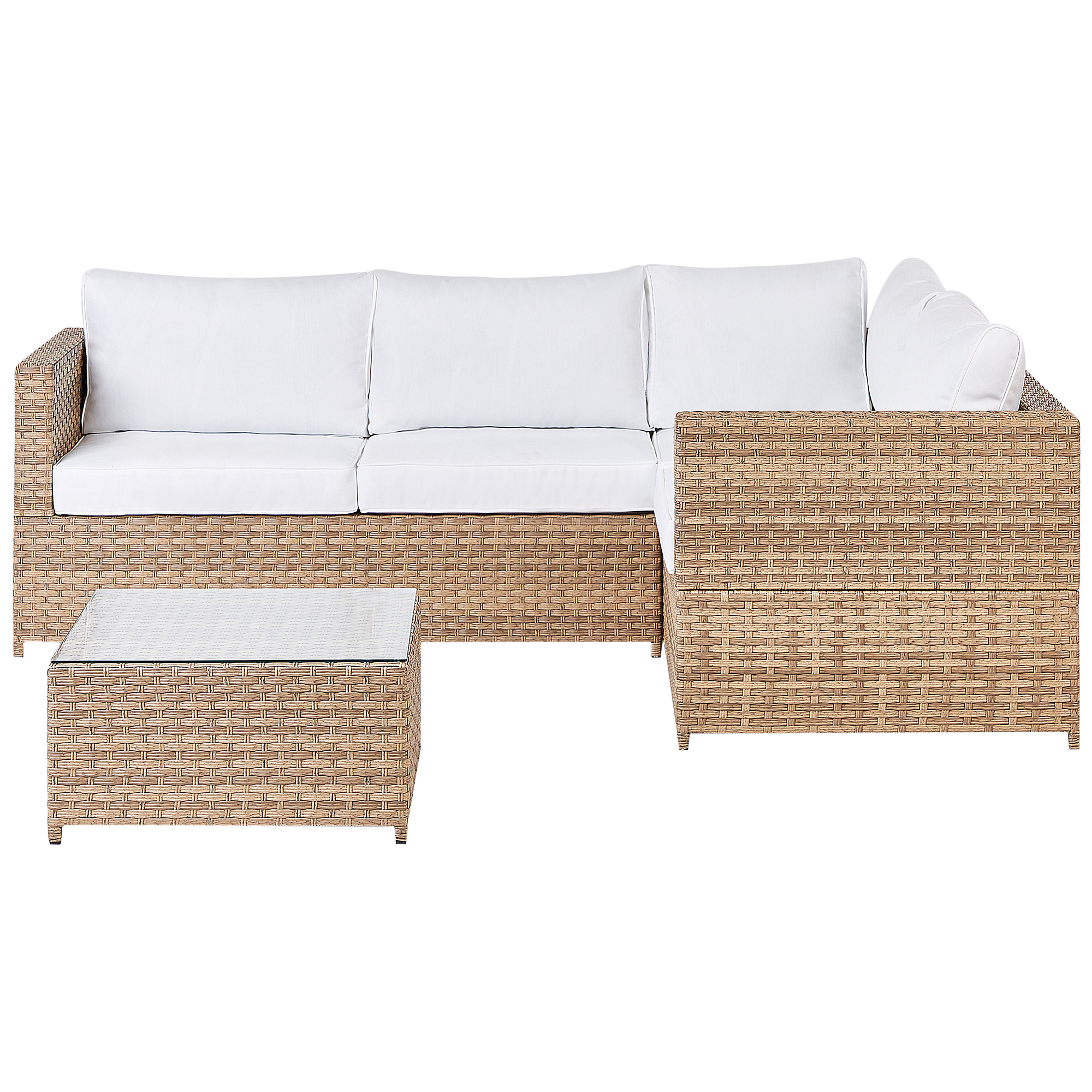 Tyylikäs puutarhan kulmasohva pikkupöydällä. Luo kutsuva ulkotila tällä ajattomalla ulkosohvaryhmällä. Vuosisadan puolivälin innoittama setti sisältää kulmasohvan ja sohvapöydän. Ne on valmistettu kestävästä ja vankasta teräksestä, joka on päällystetty tyylikkäällä vaalealla polyrottingilla. Modulaaristen osien ansiosta voit asettaa sohvan kahdeksi erilliseksi 2-istuttavaksi sohvaksi tai yhdistää sen kulmasohvaksi. Luonnonvalkoiset, paksusti pehmustetut istuin ja selkätyynyt tarjoavat erinomaista mukavuutta. Sohvapöytä on viimeistelty karkaistulla lasitasolla, joka tarjoaa runsaasti tilaa naposteltaville ja juomille.