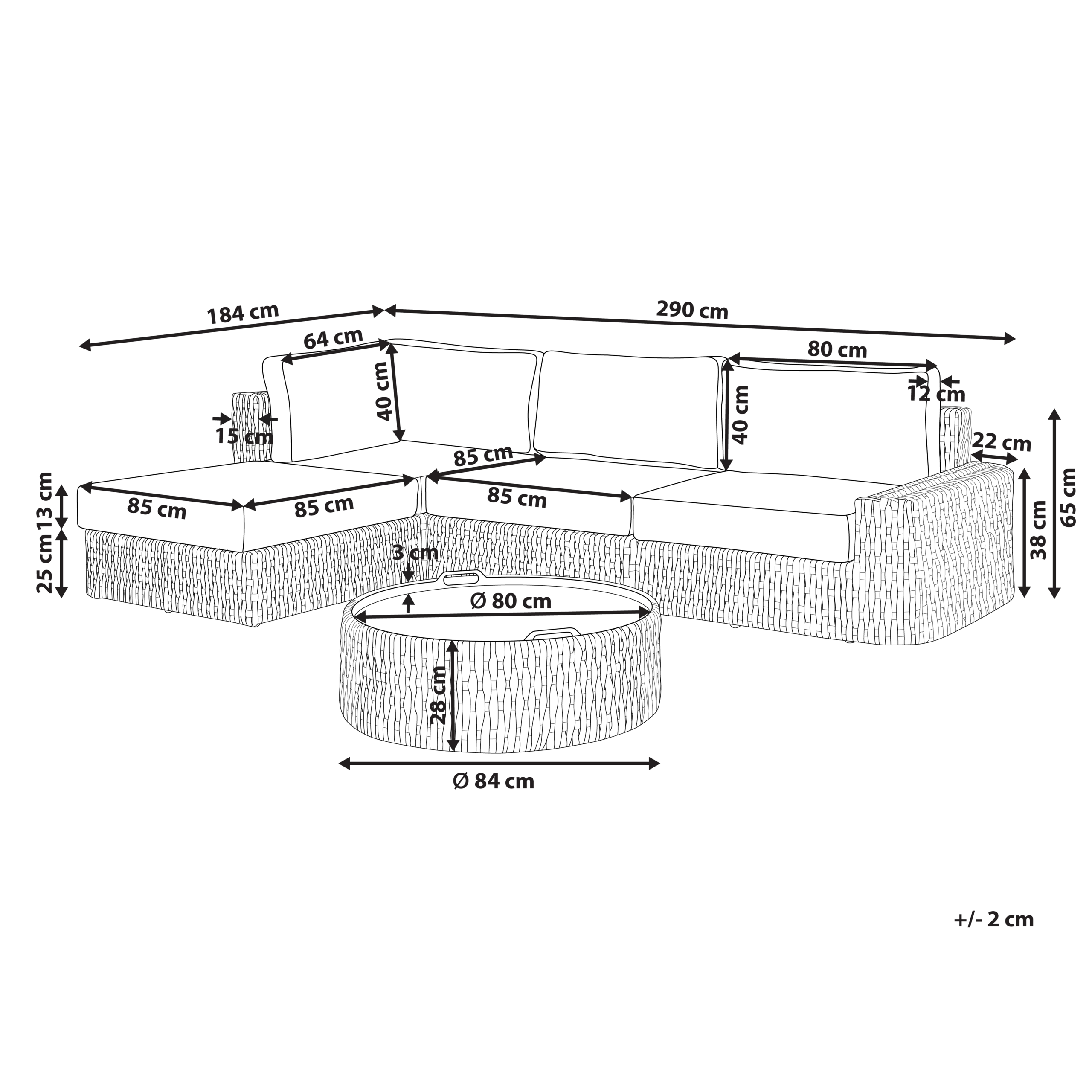 Kulmasohvan mitat: 290x184x65