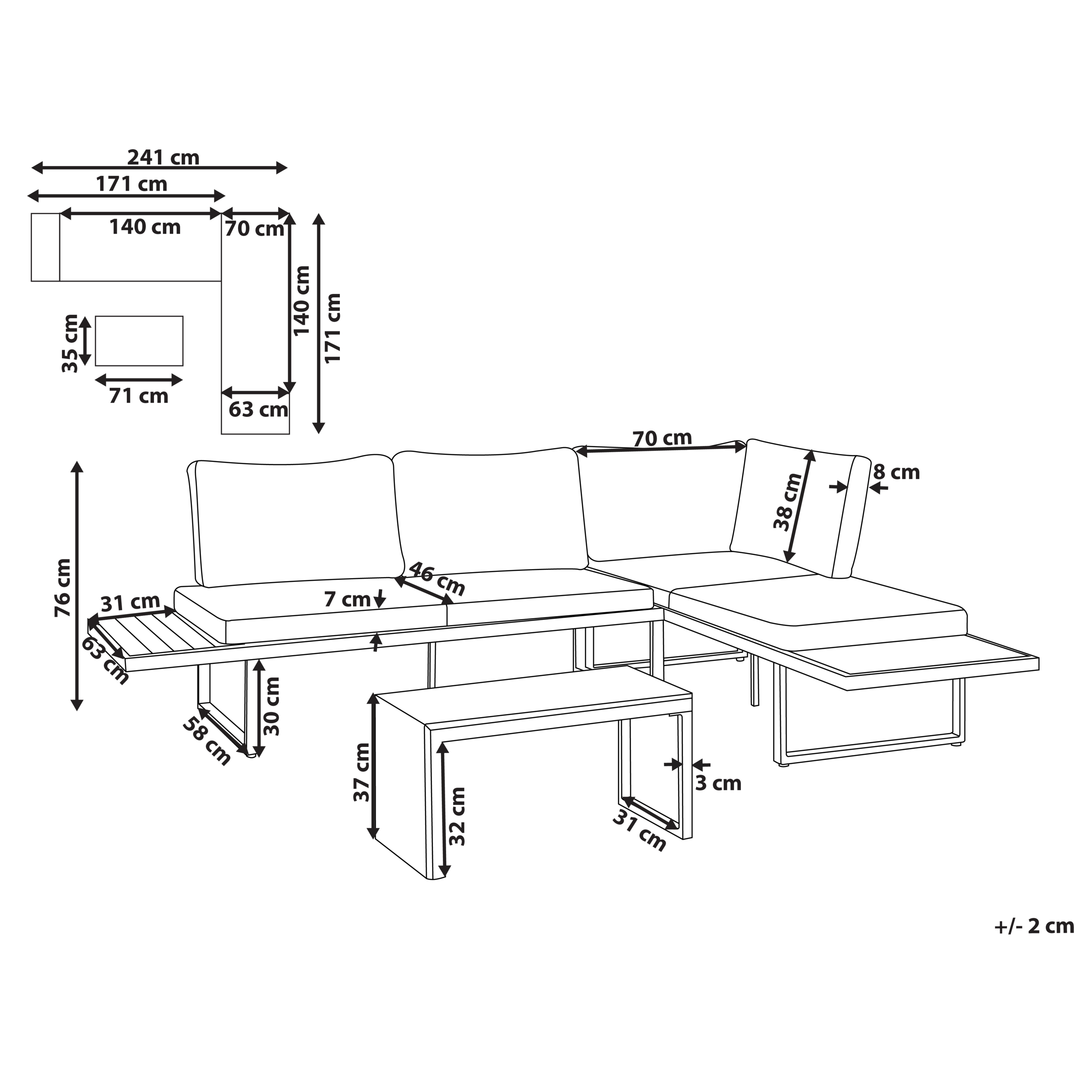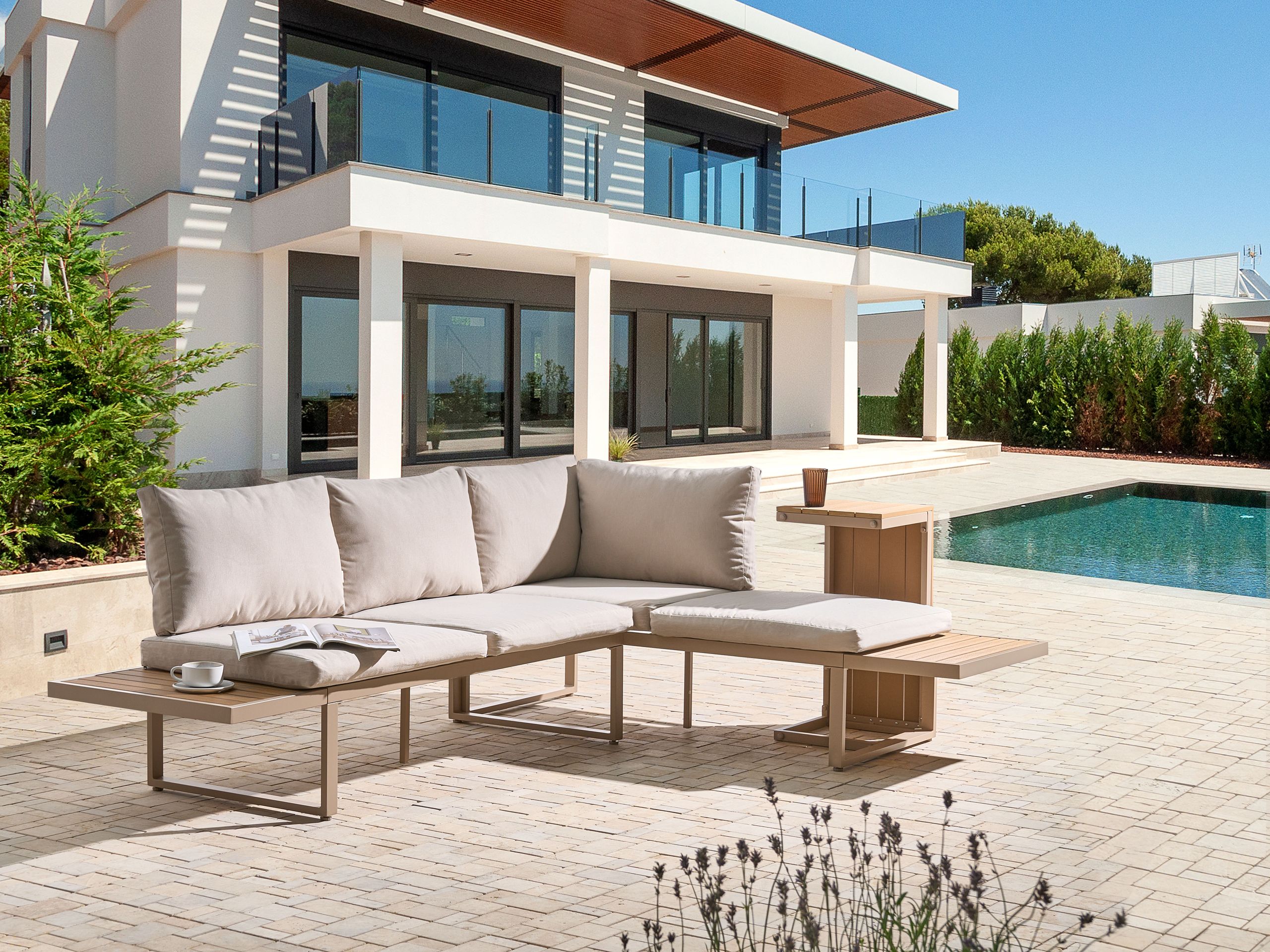 Moderni moduulisohvaryhmä sohvapöydällä. Luo moderni ulkotila, jossa rentoutua tällä tyylikkäällä ulkosohvaryhmällä. Modulaarinen kulmasohva on helppo asettaa erikseen kahdeksi pieneksi sohvaksi tai vastakkain 2 hengen lepotuoliksi. Mukana tulevat paksut pehmusteet sekä sohvapöytä nostavat mukavuuden uudelle tasolle. Kestävästä ja helppohoitoisesta jauhemaalatusta alumiinista sekä muovisesta puusta valmistetut kalusteet säilyttävät ulkonäkönsä vuosien ajan.