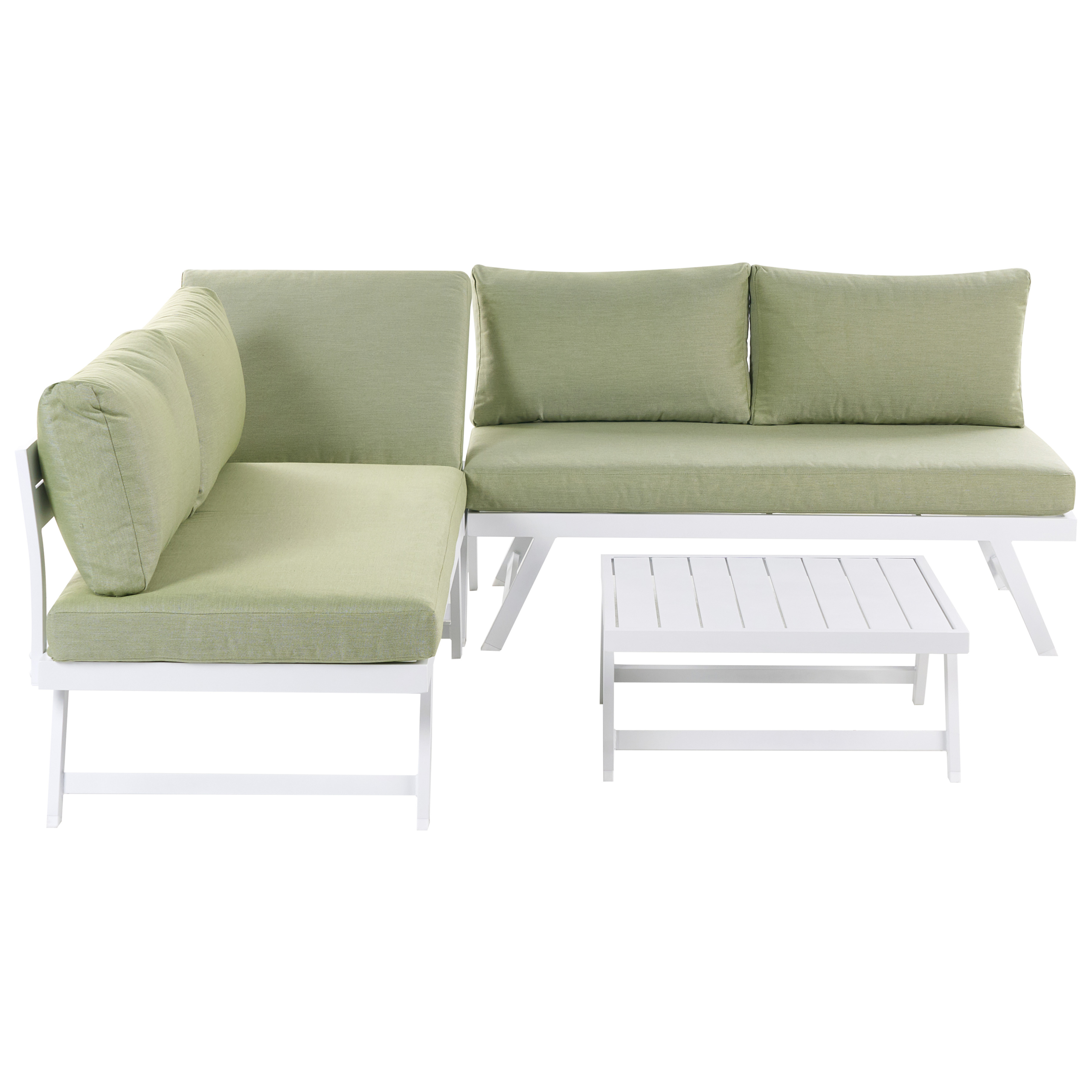 Skandinaavinen puutarhan sohvaryhmä. Tämä kahdesta sohvasta ja sohvapöydästä koostuva ulkosohvaryhmä sopii täydellisesti jokaiseen ulkotilaan. Useita sääolosuhteita kestävästä alumiinista valmistettu runko on kestävä ja helppohoitoinen. Paksut vihreät polyesterityynyt takaavat mukavuuden, ja niissä on irrotettavat, helposti pestävät päälliset. Toinen sohvista on varustettu rahilla, jossa on säädettävä istuin. Rahin avulla sohva on helppo muuttaa lepotuoliksi, jossa rentoutua ja nauttia auringosta. Modulaarisen ominaisuutensa ansiosta sohvat voidaan järjestää joko yhteen tai erikseen haluamallasi tavalla. Tyylikäs sohvapöytä tarjoaa sopivasti laskutilaa.