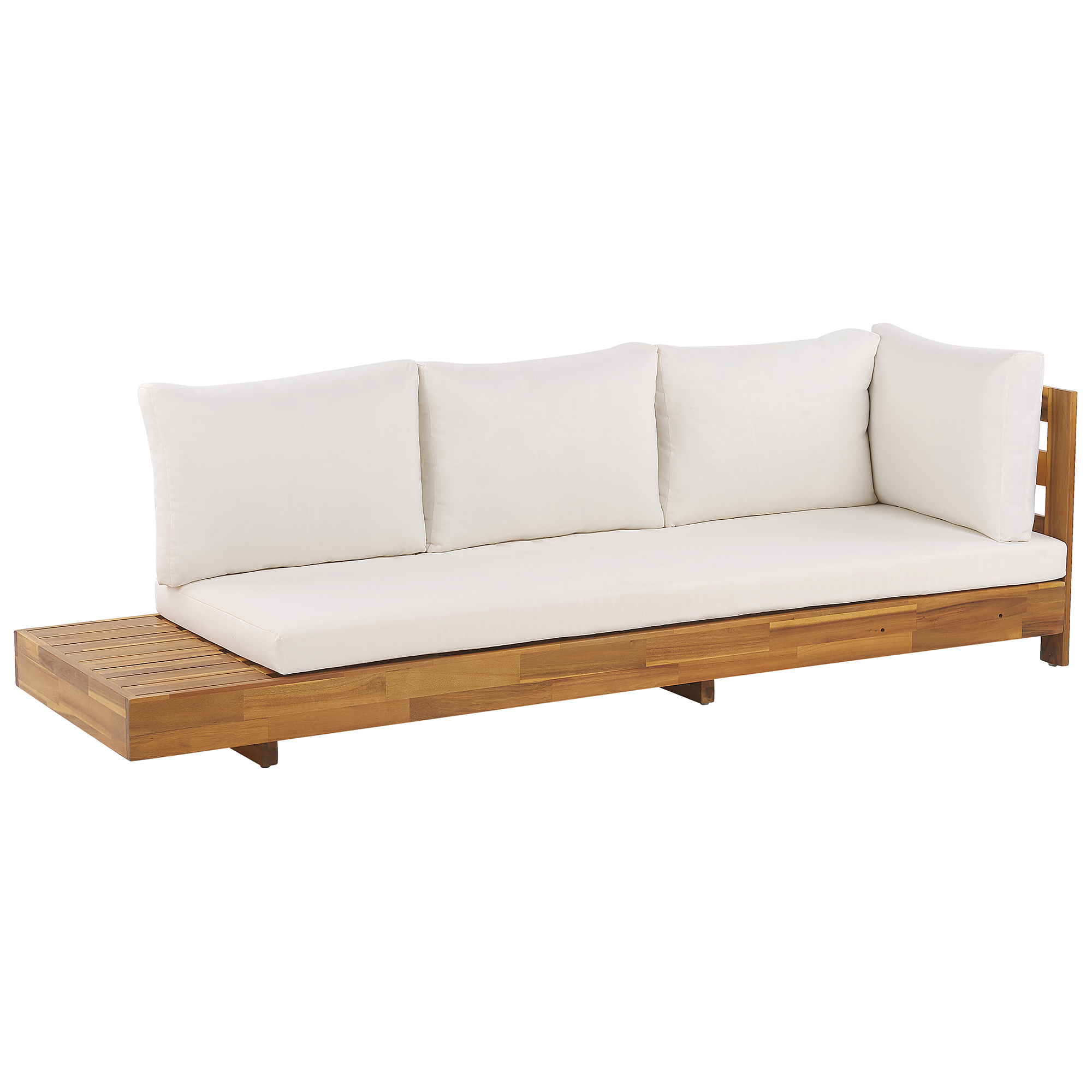 Boheemi puutarhan kulmasohva sohvapöydällä. Luo ulkotiloihisi mukava nurkkaus, jossa nauttia auringosta. Vankan akaasian lämmin sävy yhdessä yksinkertaisen muotoilun kanssa saa kalusteen sopimaan mihin tahansa sisustukseen. Suuri kulmasohva koostuu lepotuolista ja 3-istuttavasta sohvasta, jotka on helppo asettaa yhteen tai erikseen. Settiin sisältyvälle sohvapöydälle voit asettaa juomasi, aurinkolasisi tai lehtesi. Paksut luonnonvalkoiset pehmusteet tuovat lisämukavuuden. Aseta setin viereen erilaisia ruukkukasveja tuodaksesi tilaan boho-tyyliä.