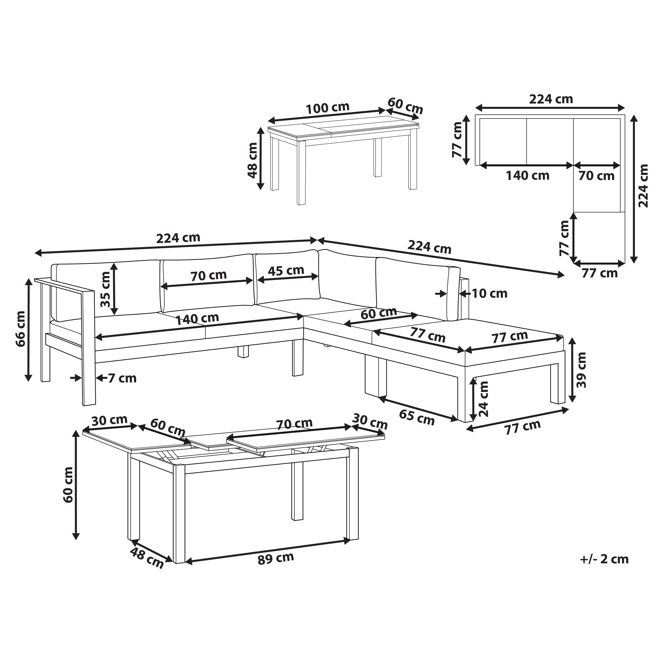 Moderni puutarhan sohvaryhmä. Kohota ulkotilaasi tällä modernilla ja trendikkäällä ulkosohvaryhmällä, jolla on tilaa jopa viidelle hengelle. Minimalistisesti muotoiltu setti sisältää kulmasohvan, sohvapöydän ja rahin, jota voidaan käyttää erillisenä istuimena tai osana sohvaa. Kestävät alumiinirungot on viimeistelty tyylikkäällä valkoisella jauhemaalauksella, ja sohvapöydän nostettavat lasitasot lisäävät ripauksen eleganssia. Sohvapöytä sopii täydellisesti ulkoruokailuun tai rentoutumiseen juomien äärellä. Mukana tulevat paksut istuin- ja selkätyynyt tarjoavat mukavuuden, ja irrotettavat päälliset helppohoitoisuuden.