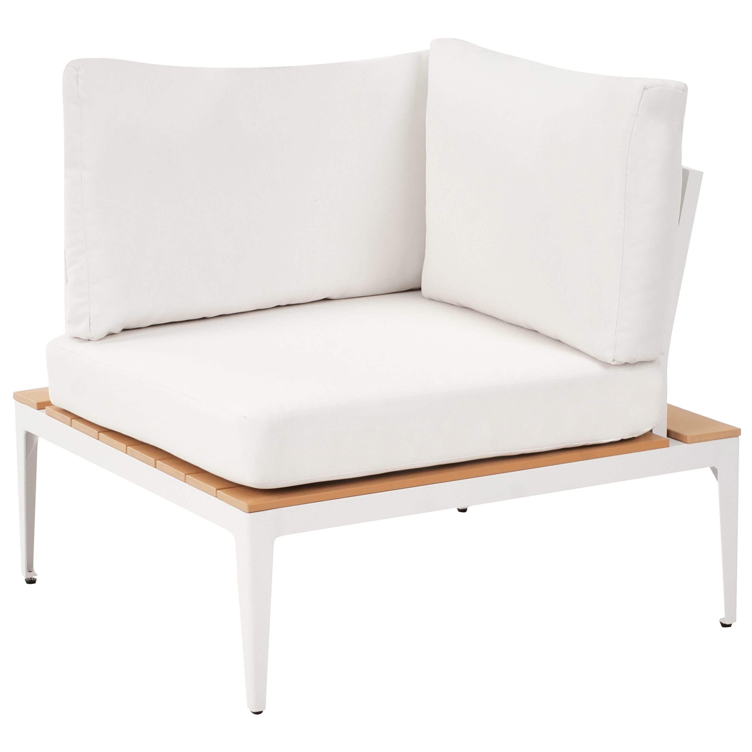 Moderni kulmasohva ja sohvapöytä puutarhaan. Tämä tyylikäs ja kutsuva modulaarinen ulkosohvaryhmä on täydellinen keskipiste mihin tahansa puutarhaan, terassille tai katettuun ulkotilaan. Kulmasohva on valmistettu kestävästä, jauhemaalatusta alumiinista, jota täydentää kaunis muovipuu. Sivuissa sijaitsevat sivupöydät on sisäänrakennettu sohvan runkoon. Suorakulmainen sohvapöytä tarjoaa tilaa erilaisille naposteltaville ja juomille. Setin mukana tulevat mukavat, paksusti pehmustetut tyynyt – viisi istuimille ja kuusi selkänojille. Vetoketjulliset päälliset on valmistettu likaa hylkivästä ja käsin pestävästä polyesterikankaasta.