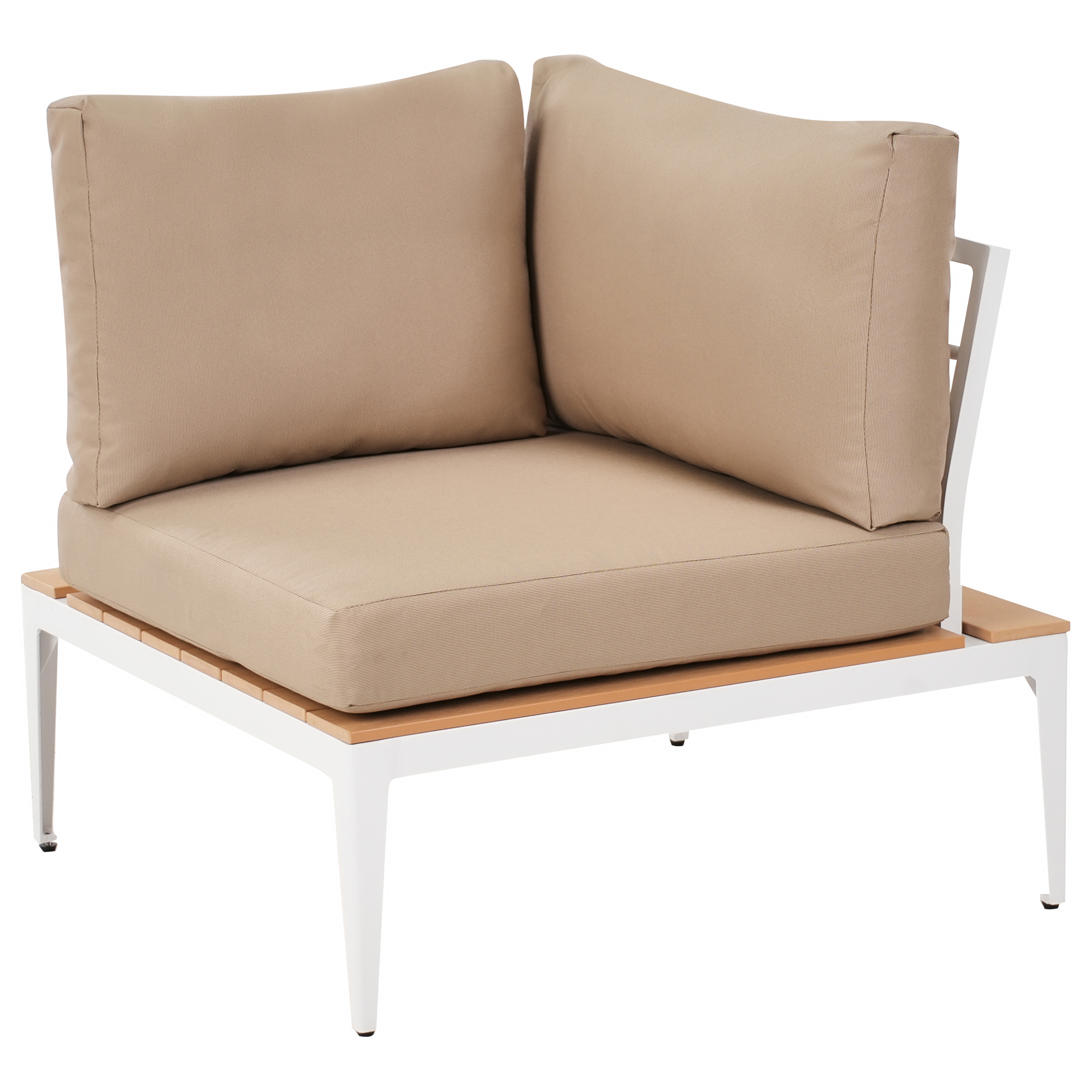 Moderni kulmasohva ja sohvapöytä puutarhaan. Tämä tyylikäs ja kutsuva modulaarinen ulkosohvaryhmä on täydellinen keskipiste mihin tahansa puutarhaan, terassille tai katettuun ulkotilaan. Kulmasohva on valmistettu kestävästä, jauhemaalatusta alumiinista, jota täydentää kaunis muovipuu. Sivuissa sijaitsevat sivupöydät on sisäänrakennettu sohvan runkoon. Suorakulmainen sohvapöytä tarjoaa tilaa erilaisille naposteltaville ja juomille. Setin mukana tulevat mukavat, paksusti pehmustetut tyynyt – viisi istuimille ja kuusi selkänojille. Vetoketjulliset päälliset on valmistettu likaa hylkivästä ja käsin pestävästä polyesterikankaasta.