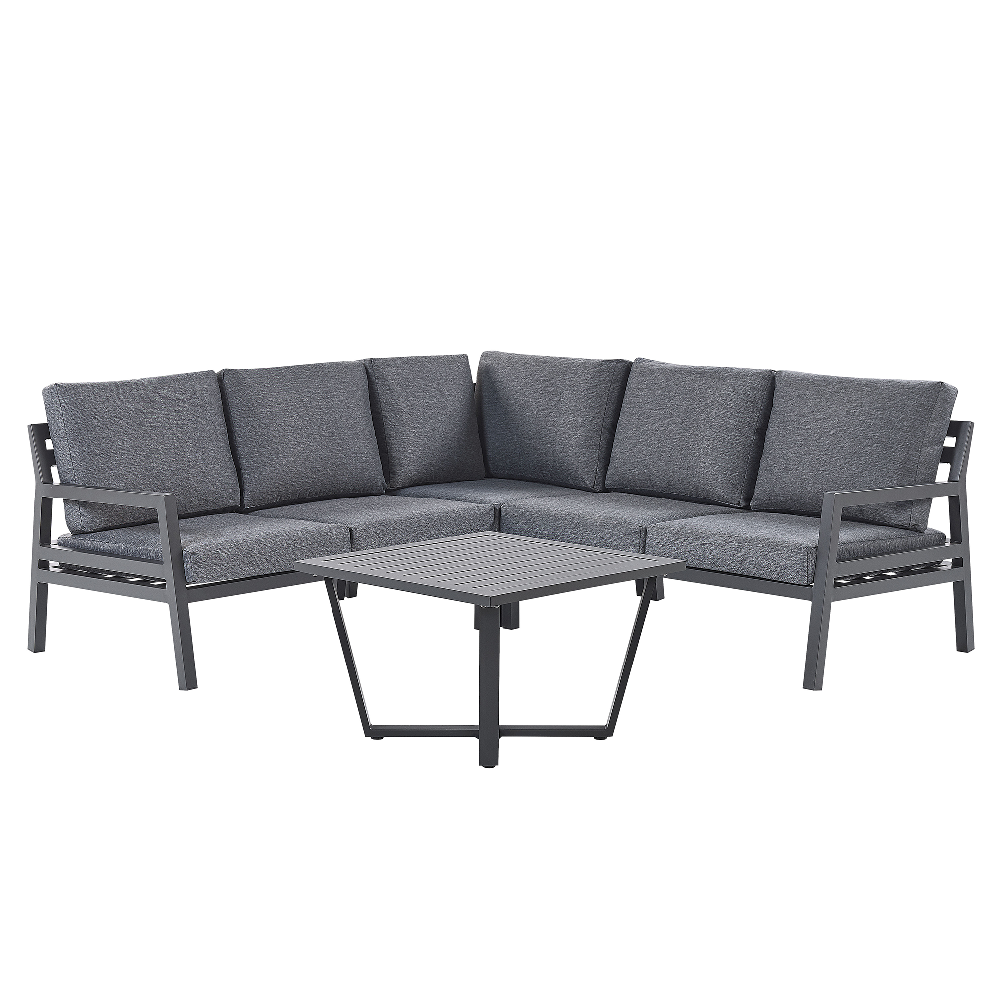 Kulmasohva ja pöytä ulkokäyttöön. Luo mukava rentoutumispaikka puutarhaasi ja tee siitä paikka, jossa kokoontua perheen tai ystävien kanssa tällä ulkosohvaryhmällä. Kestävästä mustaksi jauhemaalatusta alumiinista valmistetut kalusteet kestävät vuosien käytön ilman päivittäistä puhdistusta. Paksut tummanharmaat pehmusteet tarjoavat istumamukavuuden, tuoden modernia ilmettä ja sulautuen rungon väriin täydellisesti. Modulaaristen osien ansiosta voit istuimet miten haluat, kun taas leveä sohvapöytä tarjoaa tilaa erilaisten naposteltavien tarjoiluun.