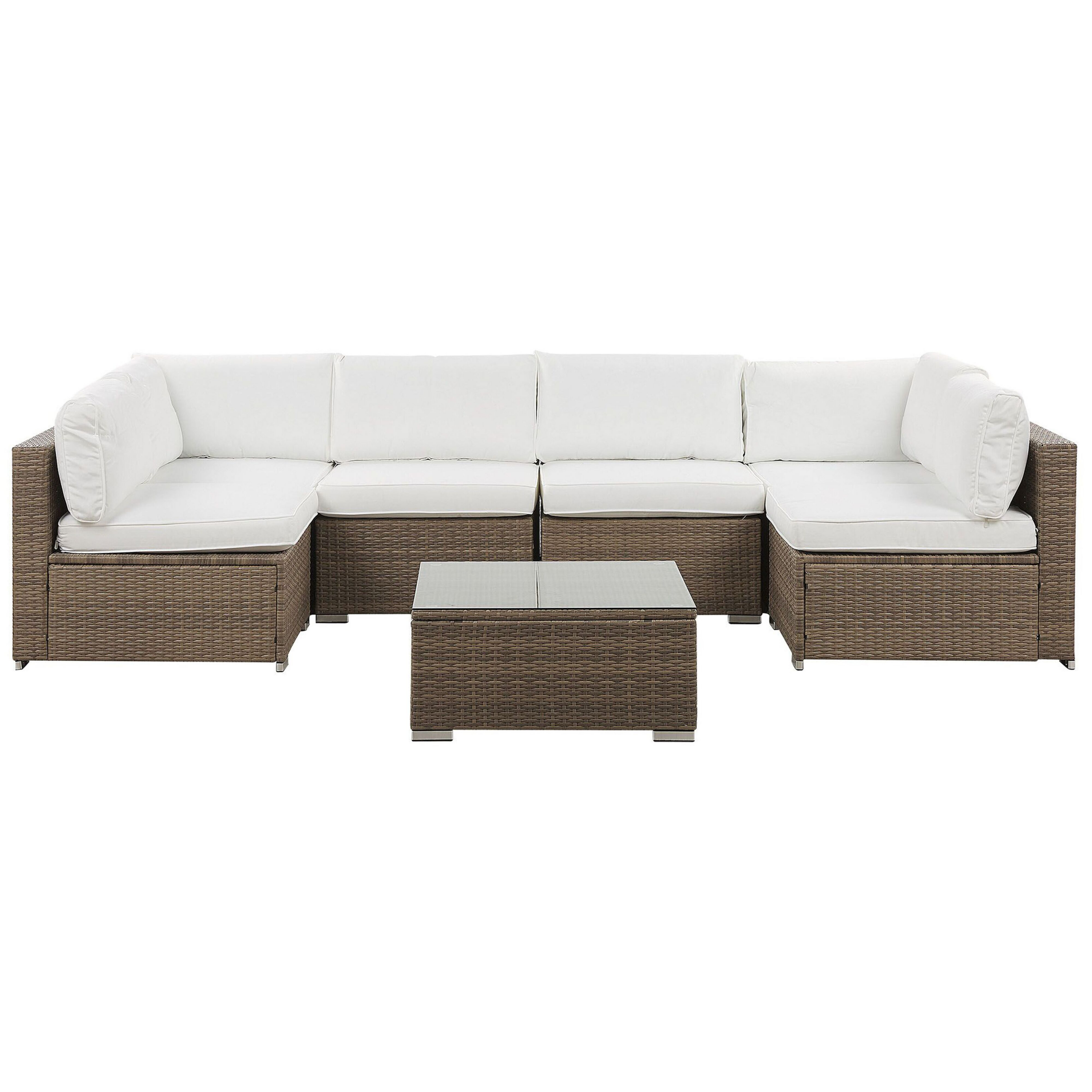 Tyylikäs moduulisohva ja pöytä terassille. Luo mukava rentoutumispaikka ulkotiloihisi tällä tyylikkäällä ulkosohvaryhmällä. Vankat jauhemaalatut alumiinirungot on päällystetty UV-kestävällä harjatulla polyrottingilla. U-muotoisesta sohvasta ja karkaistu lasitasoisesta sohvapöydästä koostuva kalustesetti on täydellinen paikka, jossa viettää aikaa yhdessä perheen ja ystävien kanssa. Paksusti pehmustetut valkoiset pehmusteet tarjoavat istumamukavuuden. Tyynynpäälliset ovat helposti pestävissä kätevien vetoketjujen ansiosta. Materiaaliensa ansiosta kalusteet ovat kestäviä ja pitkäikäisiä.
