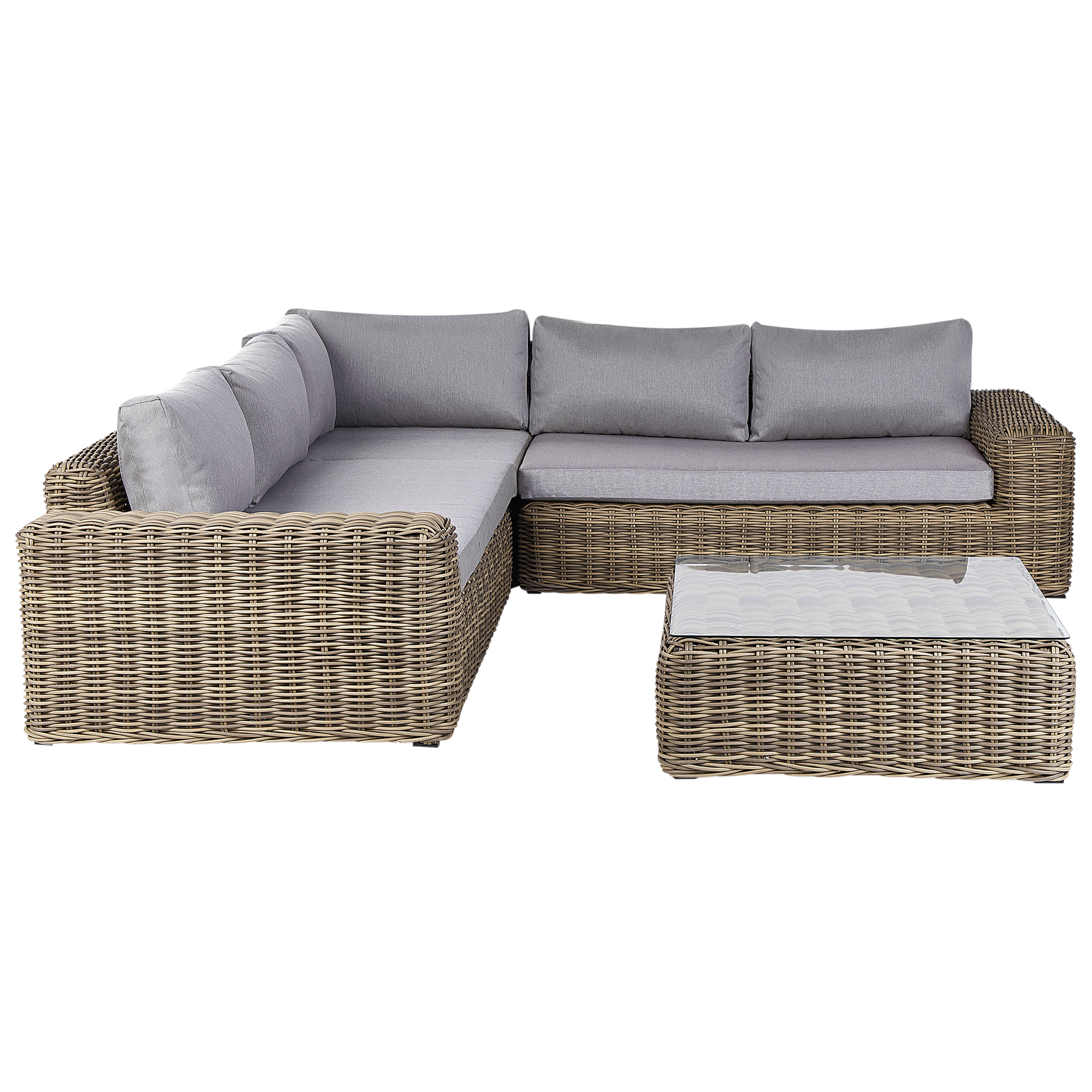 Modulaarinen puutarhan sohvaryhmä. Päivitä puutarhaasi tai terassiasi tällä ulkosohvaryhmällä. Settiin sisältyy kaksi 2-istuttavaa sohvaa, kulmapala sekä sohvapöytä, joka on helppo muuntaa rahiksi vaihtamalla sen lasitason mukana tulevaan istuintyynyyn. Kestävästä polyrottingista valmistetut ja vedenpitävillä pehmusteilla varustetut kalusteet tarjoavat viihtyisän paikan kokoontumisiin. Modulaarinen muotoilu mahdollistaa helpon uudelleenjärjestelyn, joten setti sopii monenlaisiin ulkotiloihin. Nauti toiminnallisuuden ja mukavuuden yhdistelmästä sohvaryhmällä, joka tuo tyyliä ulkotilaasi.