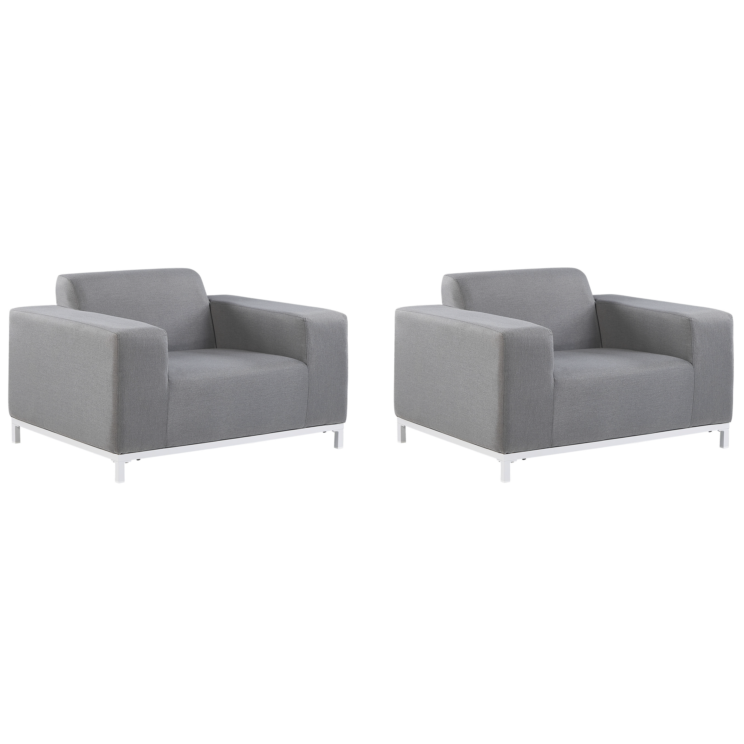 Mukavat nojatuolit ulkokäyttöön. Tämä kahden puutarhatuolin setti näyttää hyvältä puutarhassa tai terassilla, mutta se sopii myös sisäkäyttöön. Leveät käsinojat, syvä muotoilu ja hieman kallistuvat selkänojat takaavat istumamukavuuden. Nojatuolit on verhoiltu UV-säteilyä kestävällä ja vettähylkivällä harmaan värisellä polyesterillä. Valkoiseksi jauhemaalattu metallirunko takaa vakauden. Nopeasti kuivuvan vaahtomuovitäytteen ansiosta tuolit ovat hengittäviä ja kuivuvat nopeasti. Moderni muotoilu ja trendikkäät värit saavat tuolit sopimaan mihin tahansa moderniin tilaan.