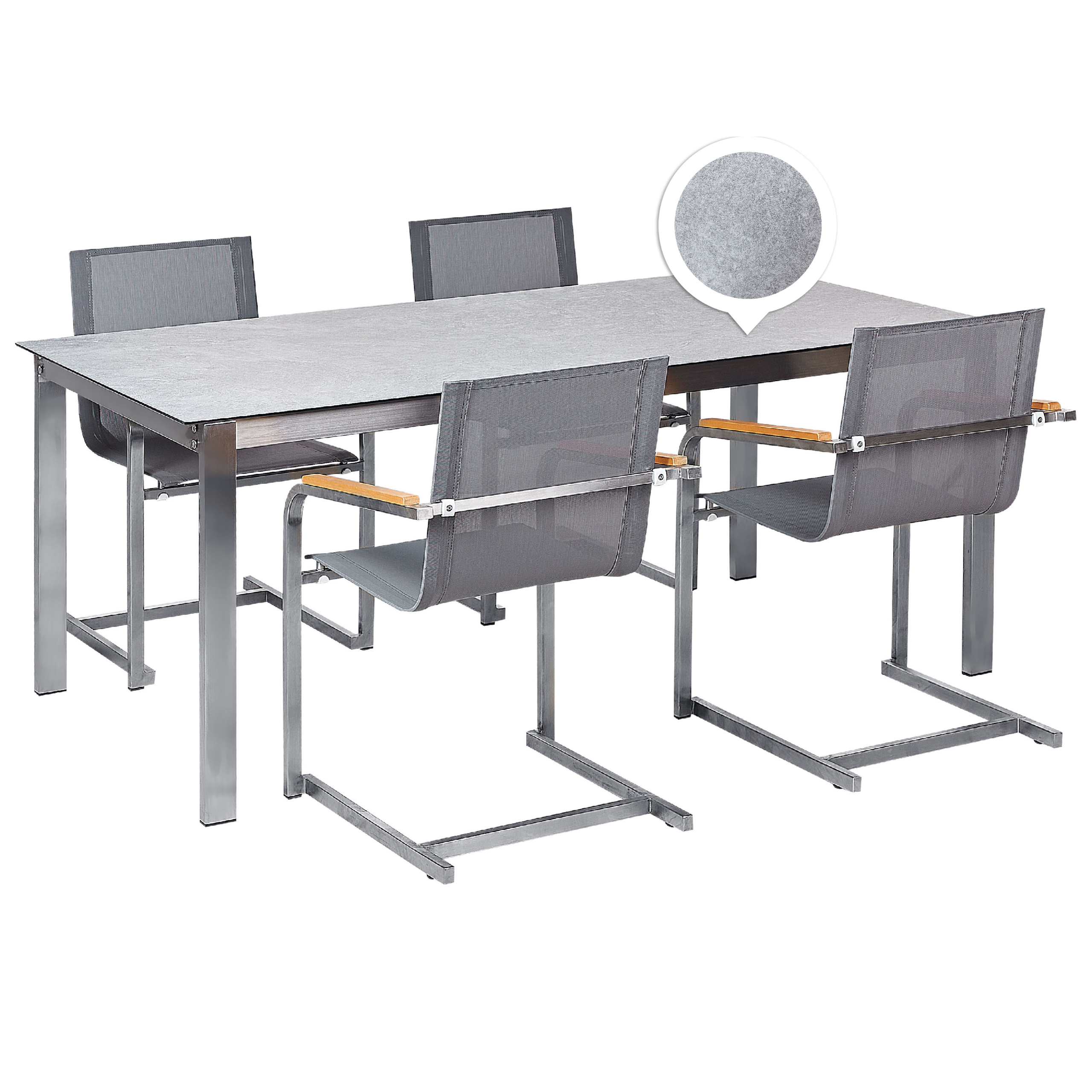 Puutarhan ruokailuryhmä kangastuoleilla. Valmistele puutarhasi kesäkauteen ja muuta se tyylikkääksi kohtaamis- ja ruokailutilaksi sinulle ja läheisillesi. Ruostumattomasta teräksestä valmistetussa pöydässä on ajattoman harmaa karkaistu lasitaso. Pöytä kestää luonnollisesti UV-säteilyä, vettä sekä ruostetta, jolloin se sopii täydellisesti erilaisiin ulkotiloihin. Suuri pöytälevy tarjoaa tarpeeksi tilaa jopa neljälle hengelle, joten kokoontumisten järjestäminen on helppoa tällä setillä. Mukana tulevissa tuoleissa on harmaat tekstiiliselkänojat, jotka täydentävät nykyaikaista ilmettä ja tarjoavat mukavan paikan istua.