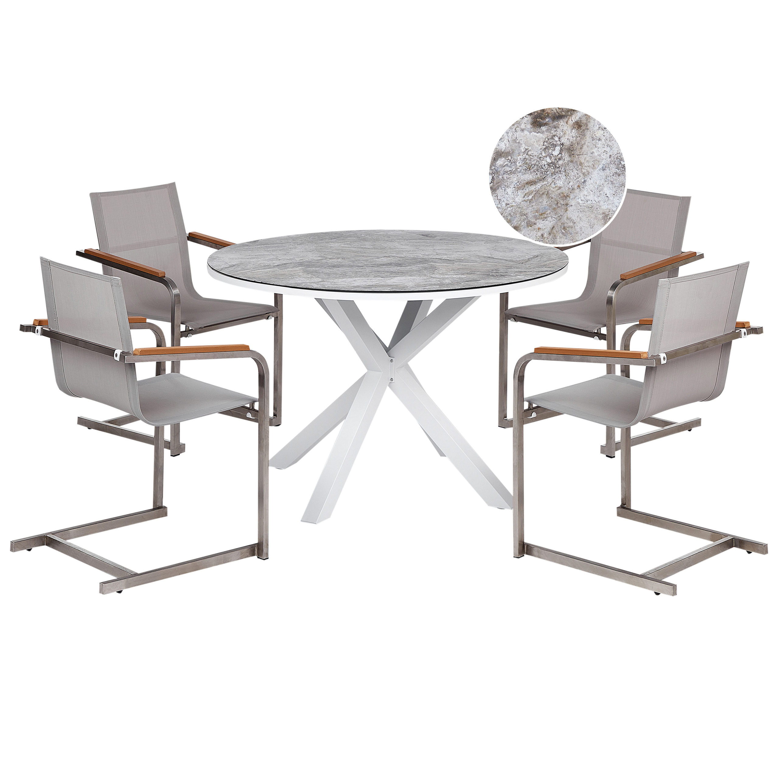 Tyylikäs puutarhan ruokailuryhmä neljälle. Tämä tyylikäs ulkoruokailuryhmä sopii erinomaisesti kokoontumisten järjestämiseen. Settiin kuuluu tilava pyöreä pöytä sekä neljä pinottavaa tuolia, joiden neutraali väripaletti sulautuu vaivattomasti erilaisiin ulkoympäristöihin. Kevyestä mutta kestävästä alumiinista valmistetun pöydän marmorikuvioitu keraaminen lasitaso tarjoaa runsaasti tilaa ruokailutarvikkeille ja tarjottaville. Tuolien ruostumattomasta teräksestä valmistettuja runkoja täydentävät kangasistuimet, jotka takaavat mukavuuden. Kestävien materiaaliensa ansiosta ruokailuryhmä kestää kevyttä sadetta, tahroja, ruostetta sekä UV-säteitä.