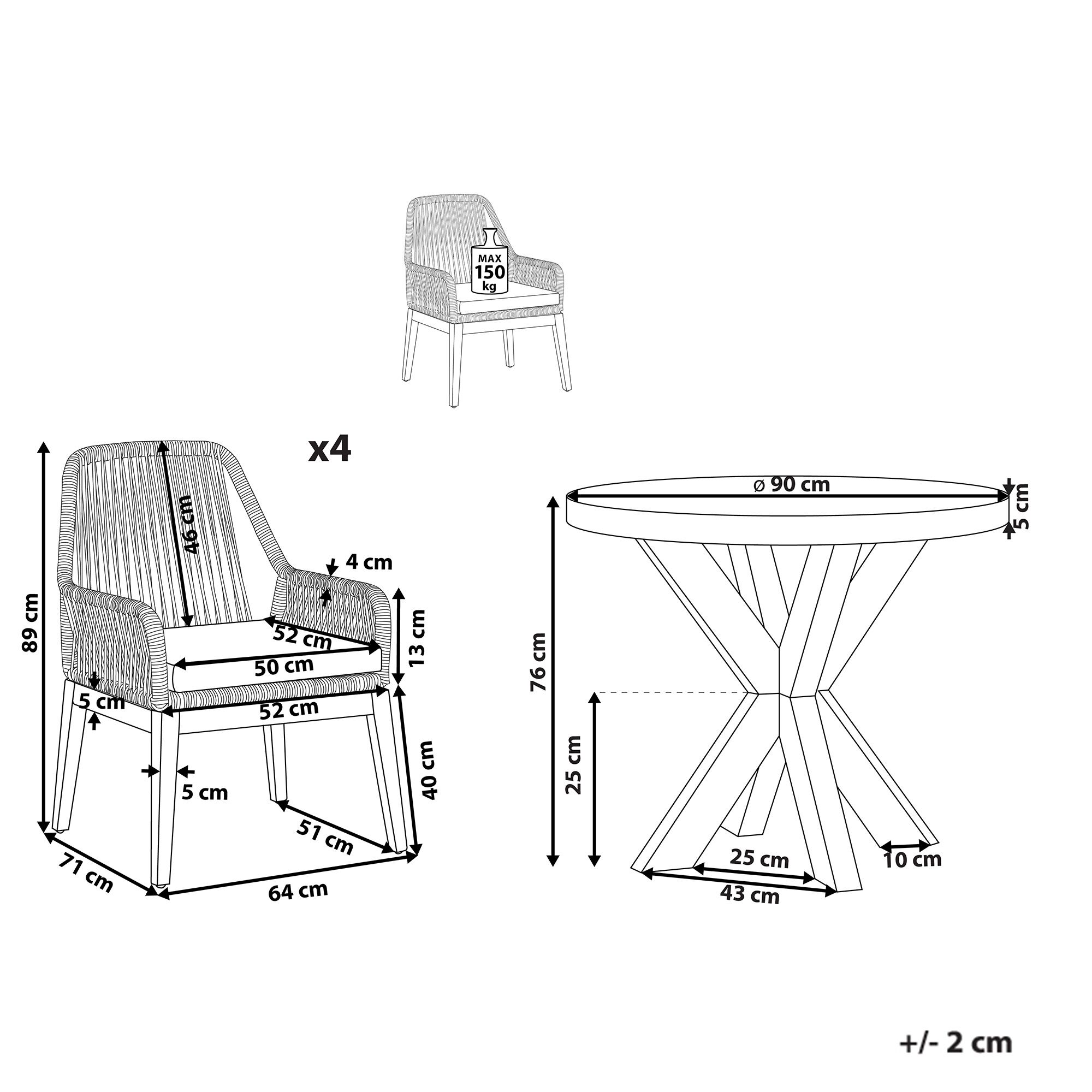 Näyttävä puutarhakalustesetti betoniefektillä. Tämä ulkoruokailuryhmä tuo tyyliä mihin tahansa ulkotilaan. Tilavalla pöytälevyllä varustettu puutarhapöytä ja mukana tulevat tuolit tarjoavat tilaa jopa neljälle hengelle. Kaikki osat on valmistettu sääolosuhteita ja kosteutta kestävistä materiaaleista, jotka ovat helppohoitoisia. Pöytälevy on valmistettu kuitusementistä. Tuolien selkänojat on valmistettu rottinkia muistuttavasta muovipunoksesta. Kalusteita korostavat akaasiasta valmistetut jalat. Mukana tulevat pehmusteet tarjoavat lisämukavuuden. Muotoilunsa ansiosta tämä kalustesetti sopii moniin ulkotiloihin, moderneista perinteisiin.