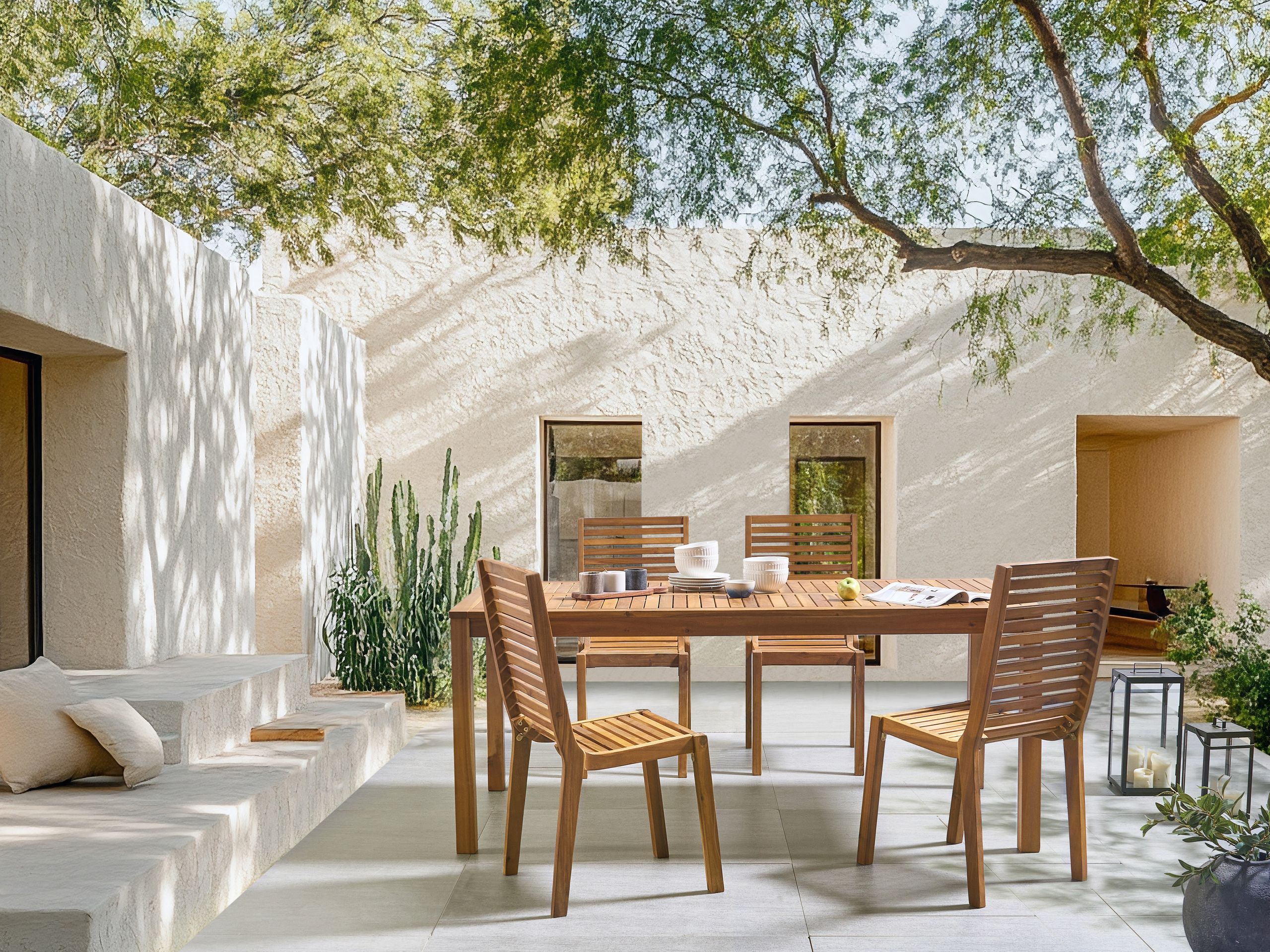 Rustiikkinen puutarhasetti neljälle. Tämä sertifioidusta akaasiapuusta valmistettu ulkoruokailuryhmä, joka koostuu pöydästä ja neljästä tuolista, tuo ripauksen luonnollista kauneutta ulkotilaasi. Sen tyylikäs, moderni muotoilu ja vankka rakenne tekevät siitä täydellisen kaikenlaisiin tilaisuuksiin rennoista aterioista perhejuhliin. Puun luonnollinen lujuus takaa, että setti kestää ja näyttää upealta monien vuodenaikojen ajan.
