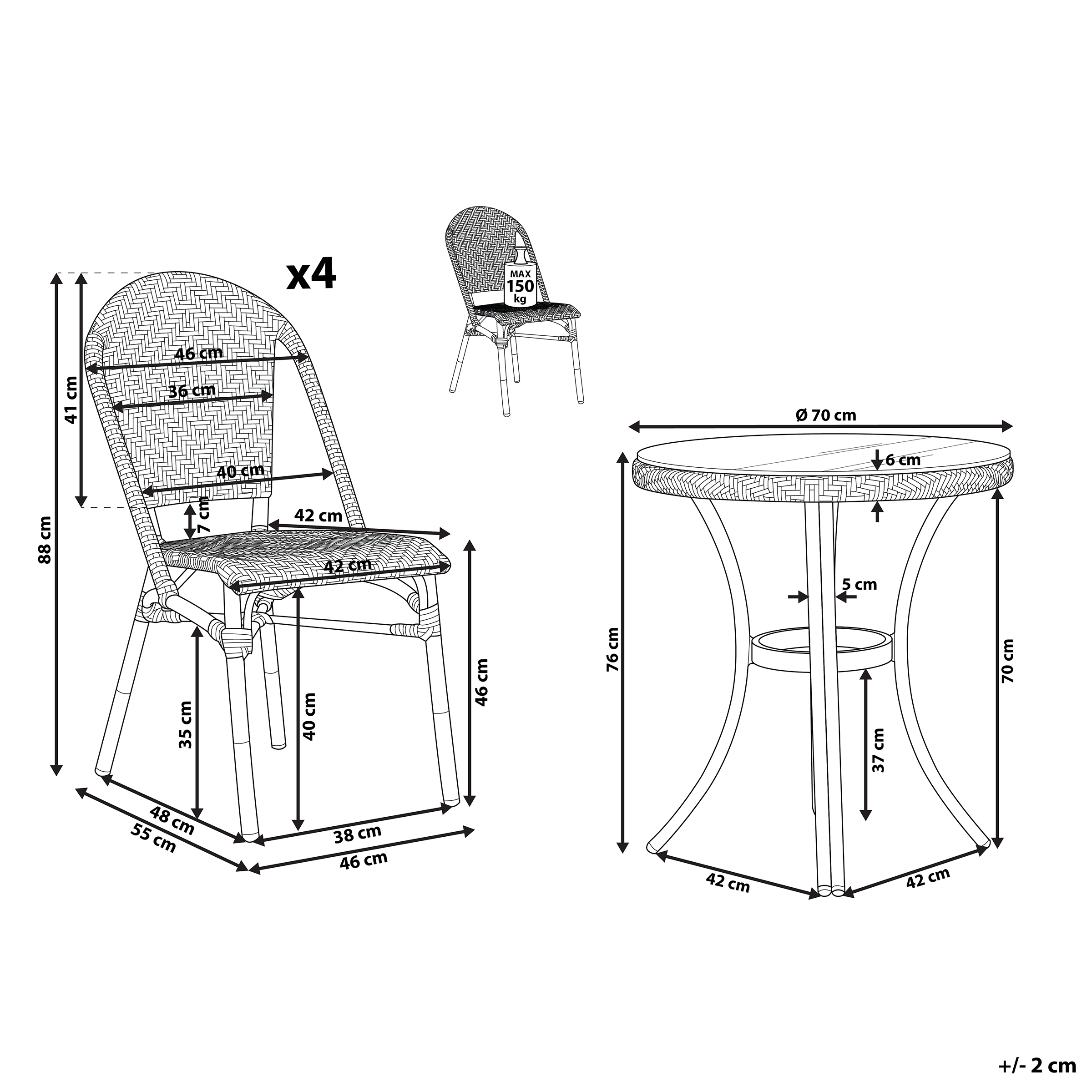 Ominaisuudet: Paksu pöytälevy karkaistusta lasista, Modernia tyyliä terassille ja puutarhaan, Sopii sekä sisä- että ulkokäyttöön, Jaloissa luistamattomat tapit, Tilaa säästävä ja pinottava, Vahva ja kestävä karkaistu lasitaso