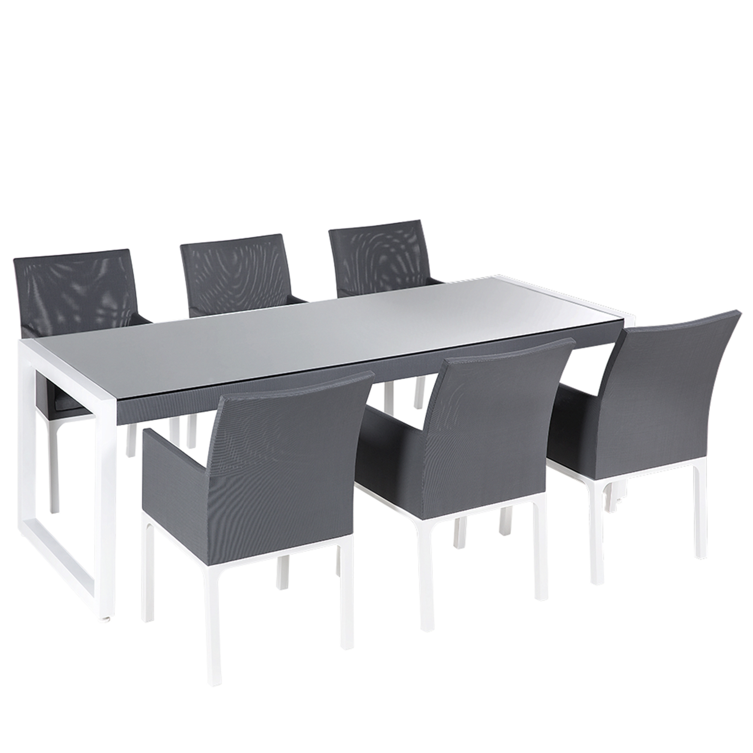 Kaunis ruokailuryhmä ulkokäyttöön. Tämä moderni seitsemästä osasta koostuva puutarhakalustesetti on täydellinen paikka perheen yhteisille aterioille. Katseita keräävä muotoilu ja yksinkertaiset muodot ovat tämän korkealaatuisen kalustesetin kohokohtia. Kestävällä, harmaan värisellä polyesterillä verhoillut tuolit on täytetty miellyttävän tuntuisella vaahtomuovilla. Materiaalit ovat nopeasti kuivuvia ja kestävät satunnaisia sadekuuroja. Pöytälevy on verhoiltu polyesterillä, jonka päällä sijaitseva karkaistu lasitaso tarjoaa paljon tilaa erilaisille naposteltaville ja juomille. Valkoiseksi jauhemaalatut alumiinirungot takaavat vakauden.