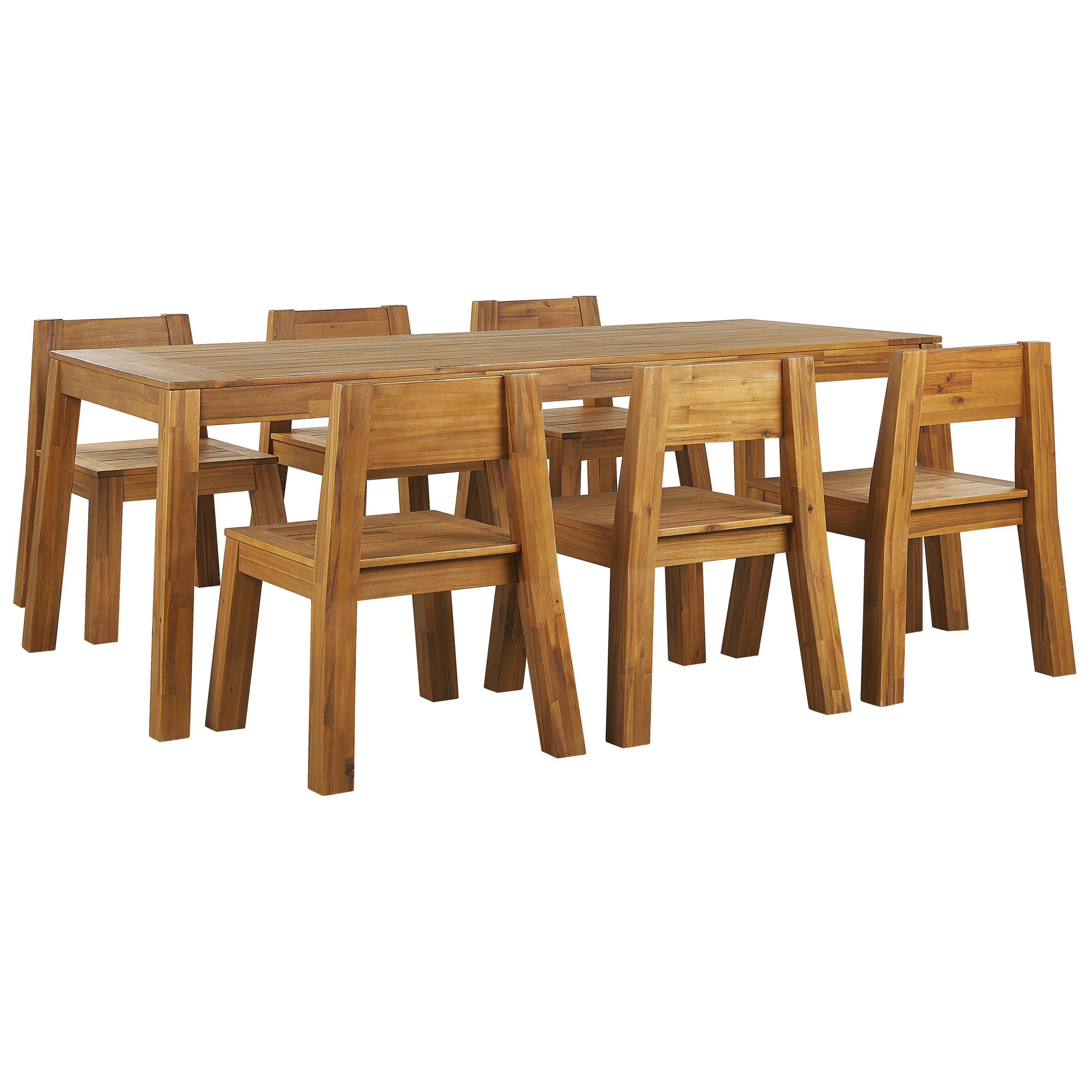 Rustiikkinen puutarhan ruokailuryhmä. Lisää sisä- tai ulkotilaan ripaus rustiikkista tyyliä tällä käytännöllisellä ja tyylikkäällä ulkoruokailuryhmällä. Setti sisältää tilavan pöydän sekä kuusi mukavaa tuolia, jotka tarjoavat sopivasti tilaa herkullisten aterioiden, naposteltavien ja juomien nauttimiseen. Kalusteet on valmistettu kokonaan korkealaatuisesta laminoidusta akasiapuusta. Puun luonnollinen vaalea sävy ja puhdas muotoilu saavat setin sulautumaan saumattomasti erilaisiin sisustustyyleihin, luoden tilaan lämpimän ja kutsuvan ilmapiirin.